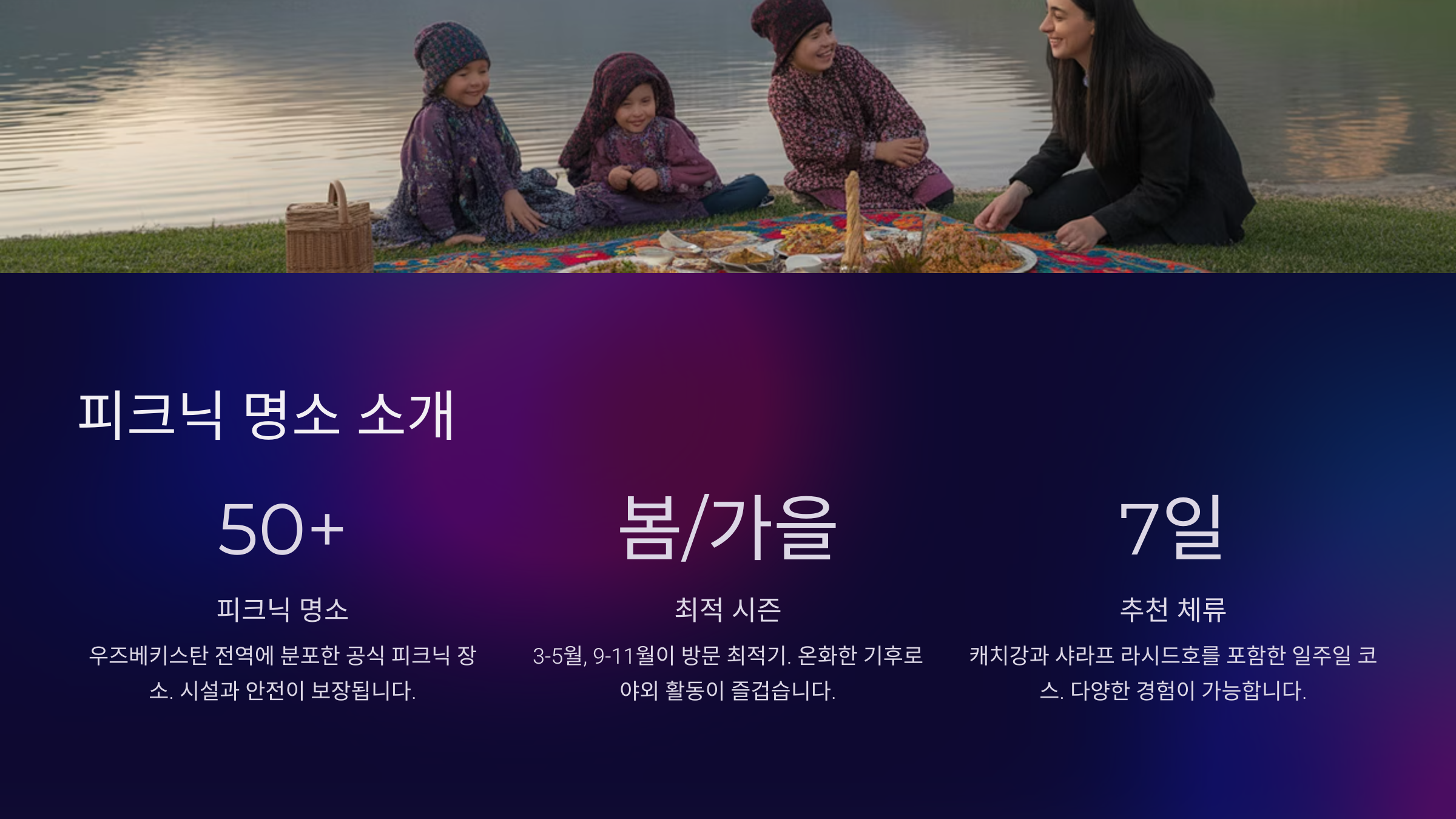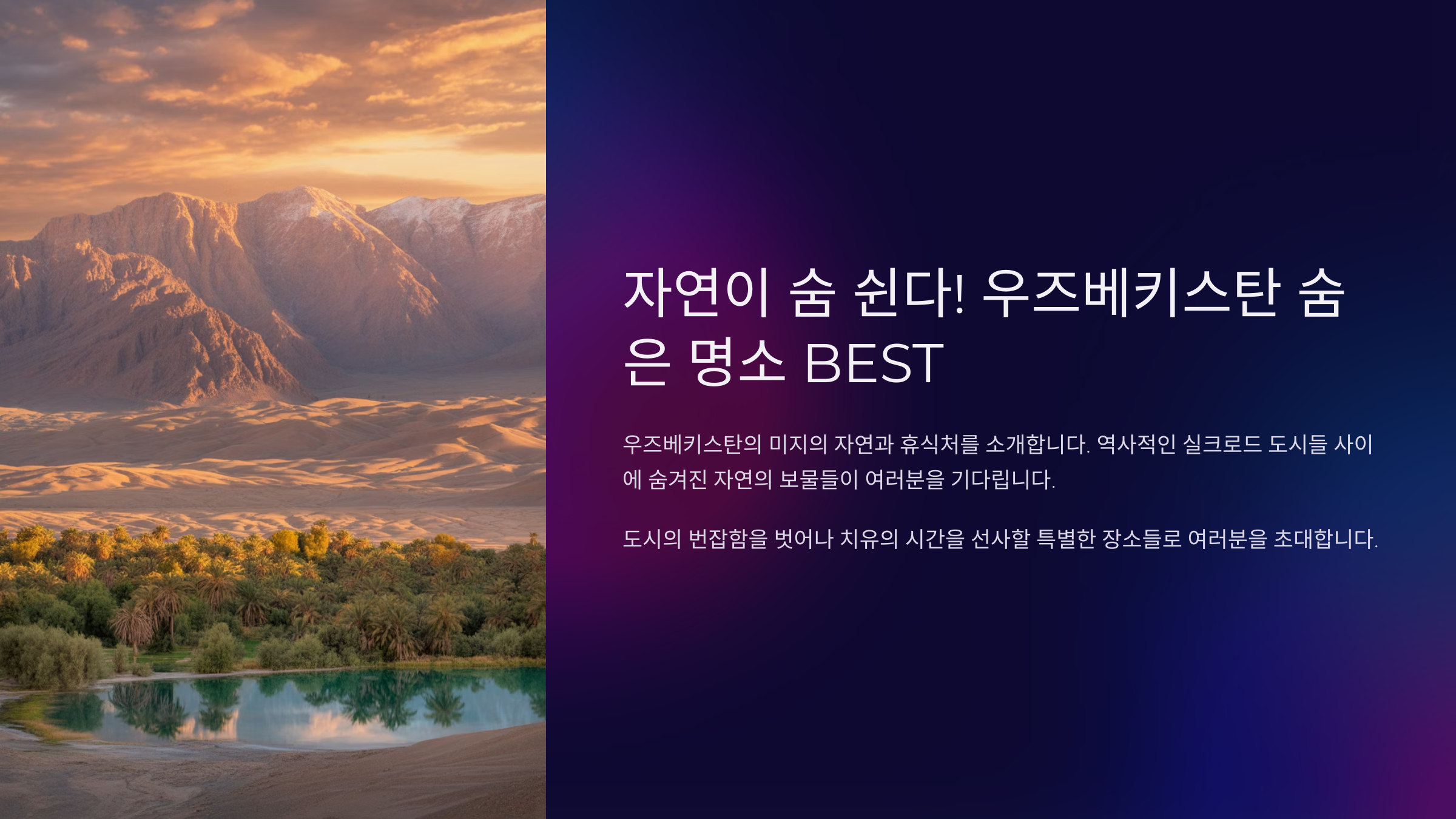 우즈베키스탄은 실크로드의 중심지이자 천혜의 자연을 간직한 숨은 보석 같은 나라예요. 사람들의 발길이 닿지 않은 순수한 자연 속에서 진정한 힐링을 경험할 수 있답니다.