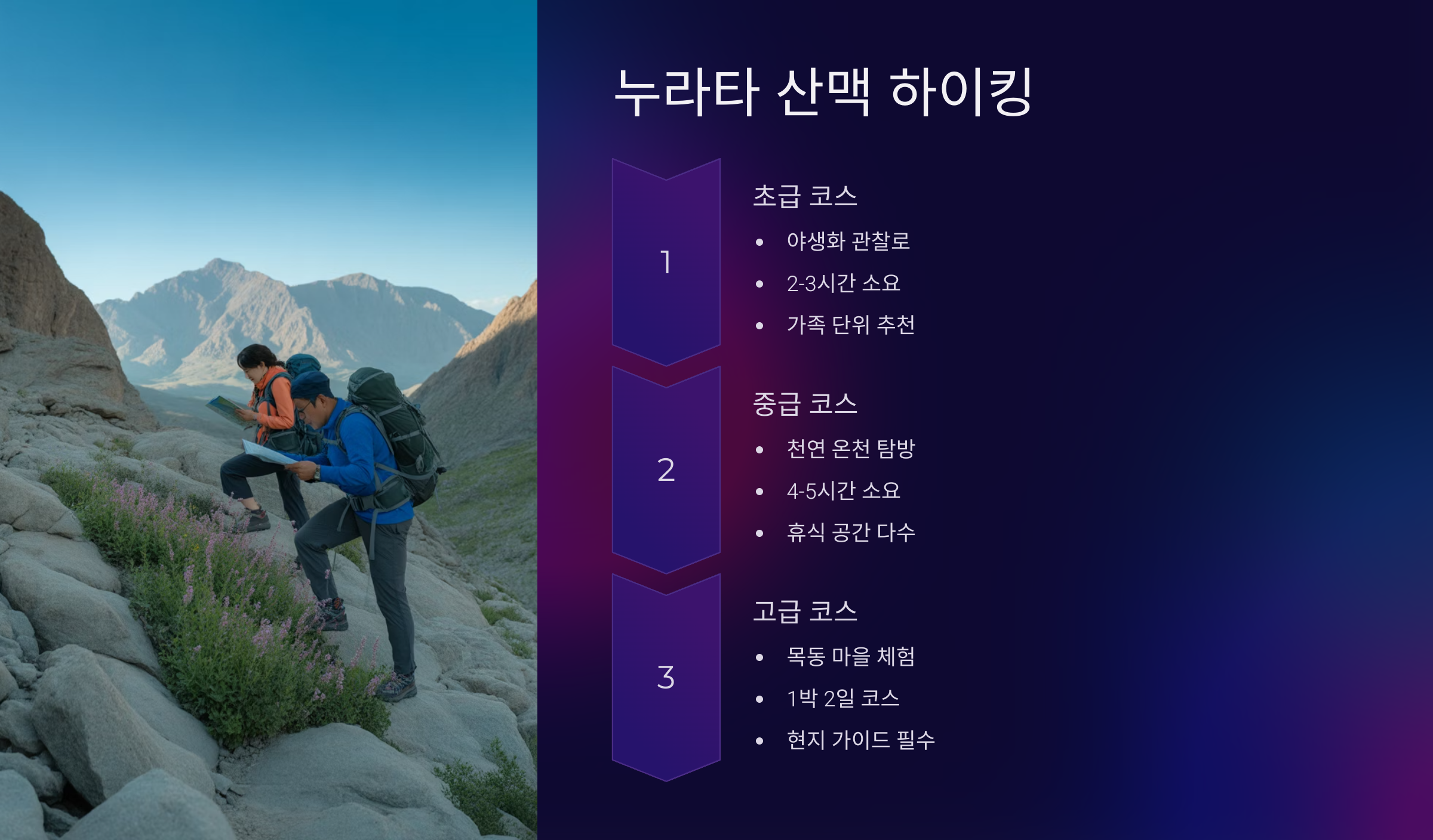 등산을 좋아한다면 누라타는 놓칠 수 없는 장소예요. 체력에 따라 난이도를 조절할 수 있는 다양한 코스가 있어 초보자도 도전해볼 수 있답니다. 🧭