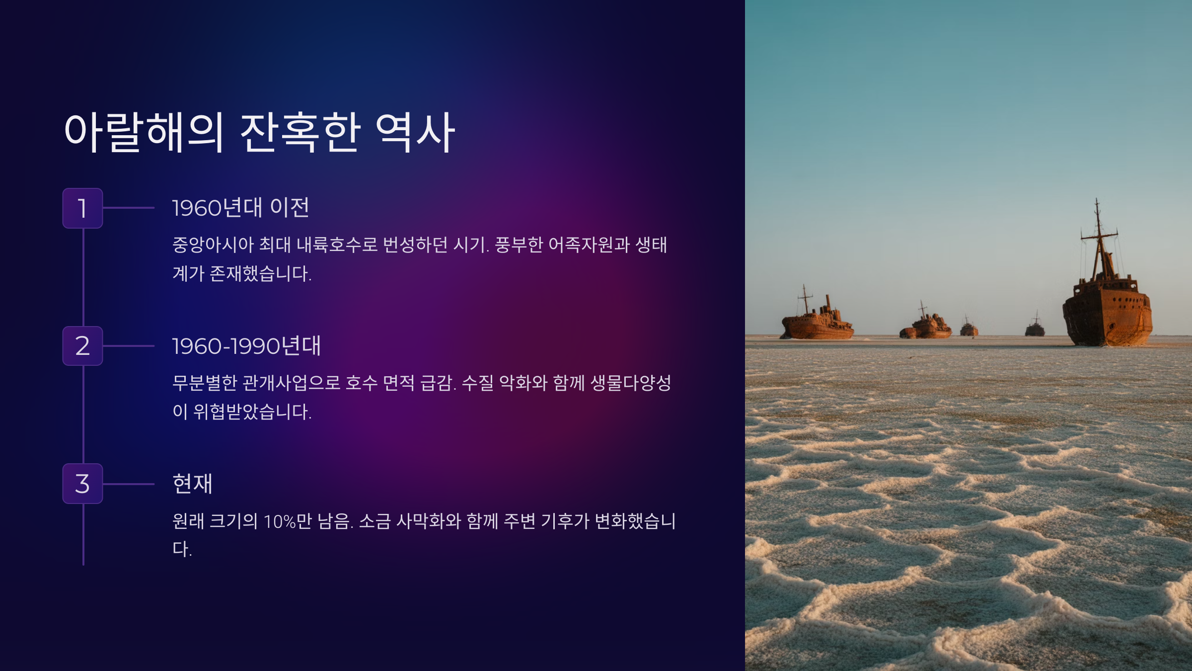 지금은 배가 모래 위에 정박된 채 부식되어 있고, 어촌 마을은 유령 도시처럼 변해버렸어요. 이 끔찍한 변화는 인간의 개발이 자연에 어떤 영향을 미치는지 강력하게 보여주는 예시예요. 관광객들은 이곳에 와서 자연의 상처를 직접 체험하고 환경의 소중함을 느끼게 된답니다.