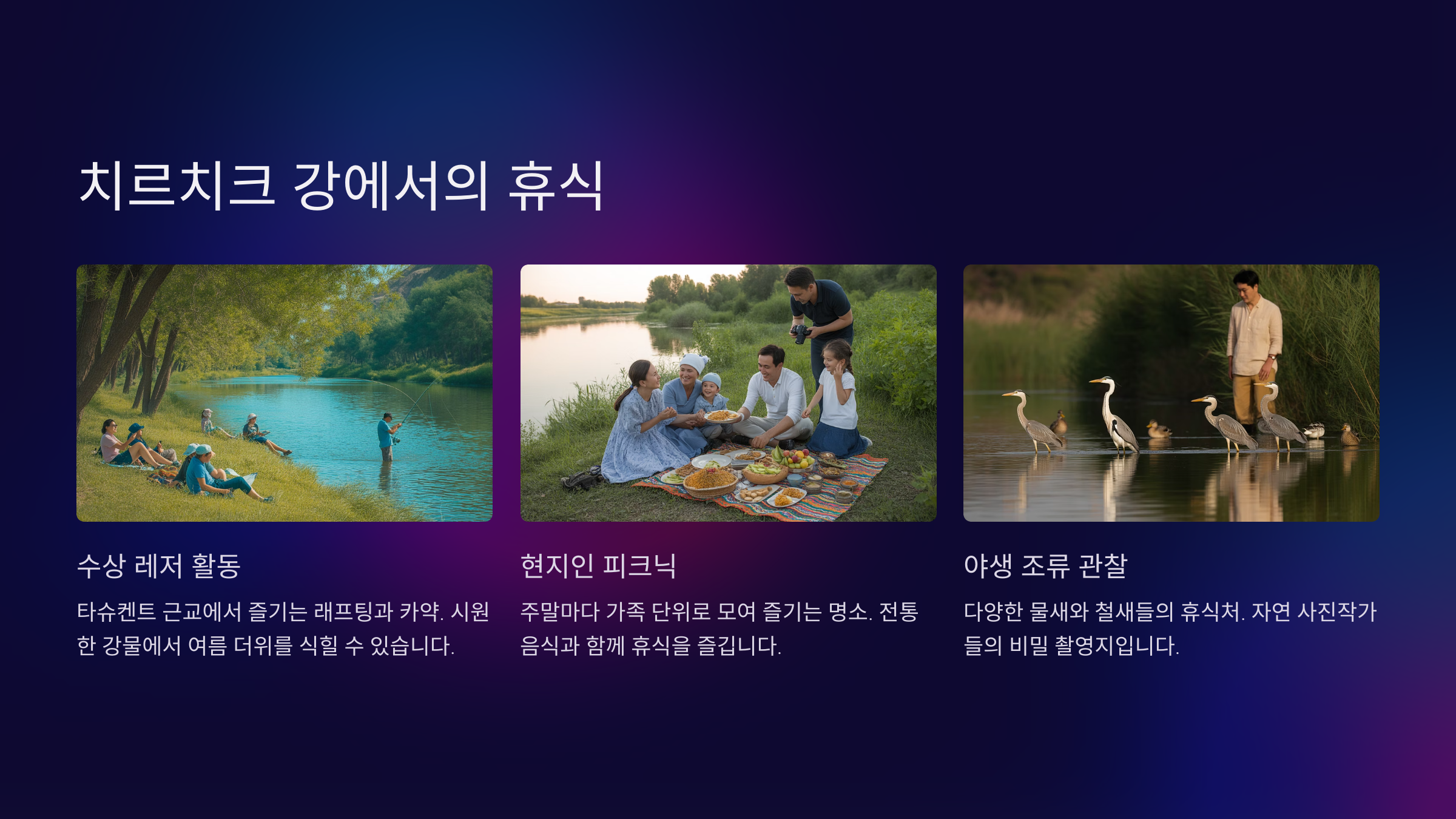 타슈켄트 근교를 흐르는 치르치크 강은 현지인들이 가장 좋아하는 여름 휴식처 중 하나예요. 산에서 흘러내려오는 맑고 시원한 물줄기가 도시의 열기를 식혀주고 있어요. 특히 주말마다 가족 단위 피크닉이 많답니다.