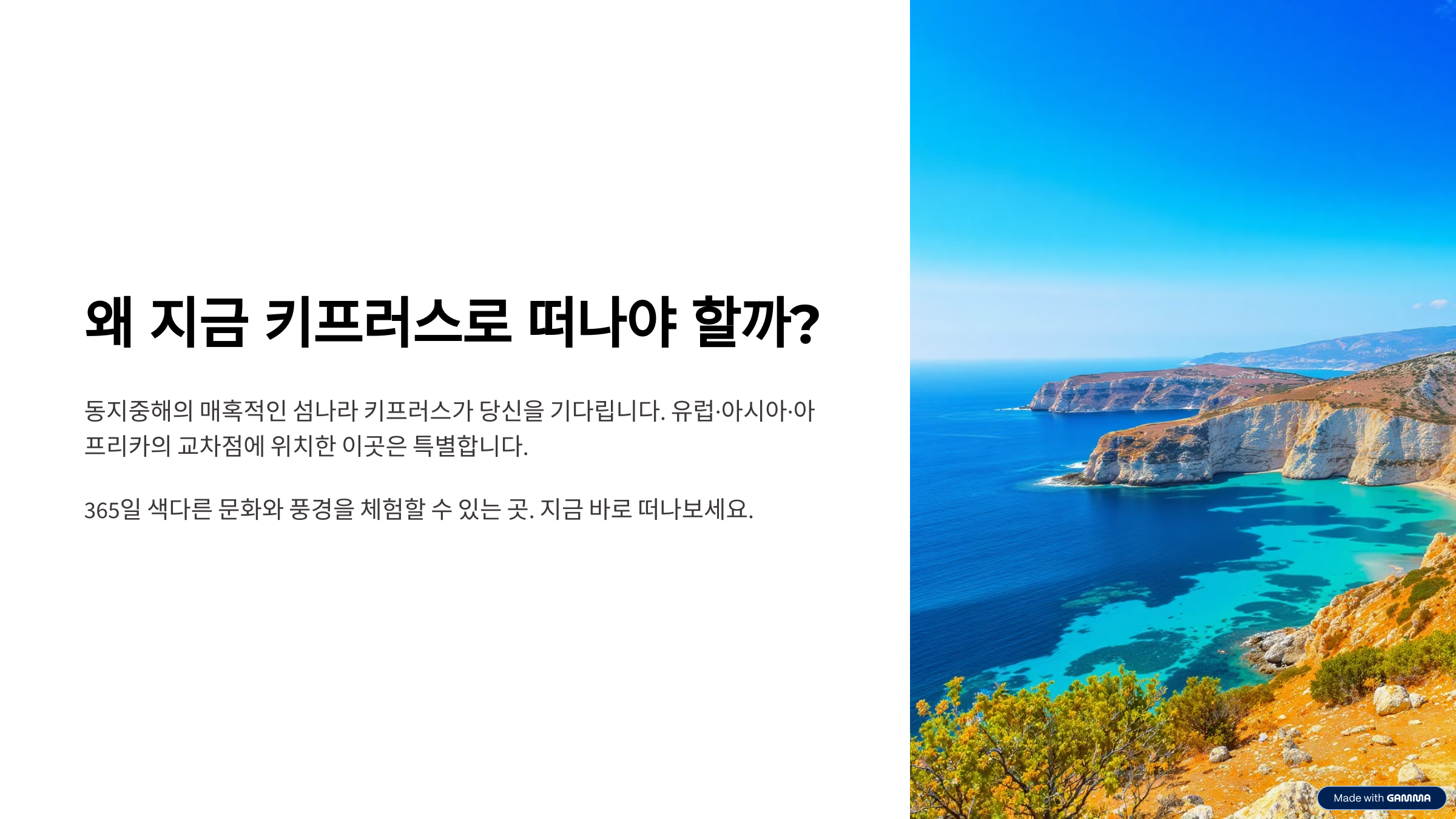 특히 2025년 기준, 관광 수요가 점점 늘어나고 있는 지금이야말로 키프러스를 여행하기 가장 좋은 시기예요. 누구보다 먼저, 가장 조용하고 평화롭게 이 섬의 매력을 느끼고 싶다면 지금 바로 떠나야 해요! 이번 글에서는 키프러스의 위치와 특징부터 핵심 도시, 계절별 꿀팁, 문화체험까지 완벽 정리해드릴게요. 😊