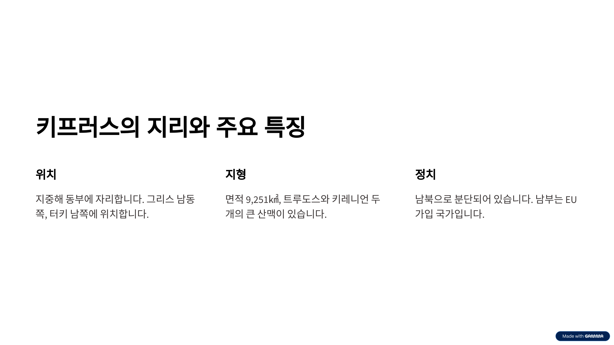키프러스는 지중해 동부에 위치한 섬나라로, 터키 남쪽, 시리아 서쪽에 자리하고 있어요. 위치적으로 유럽과 중동, 아프리카가 만나는 교차점에 있어 역사적으로도 다양한 문명과 영향을 주고받았답니다.