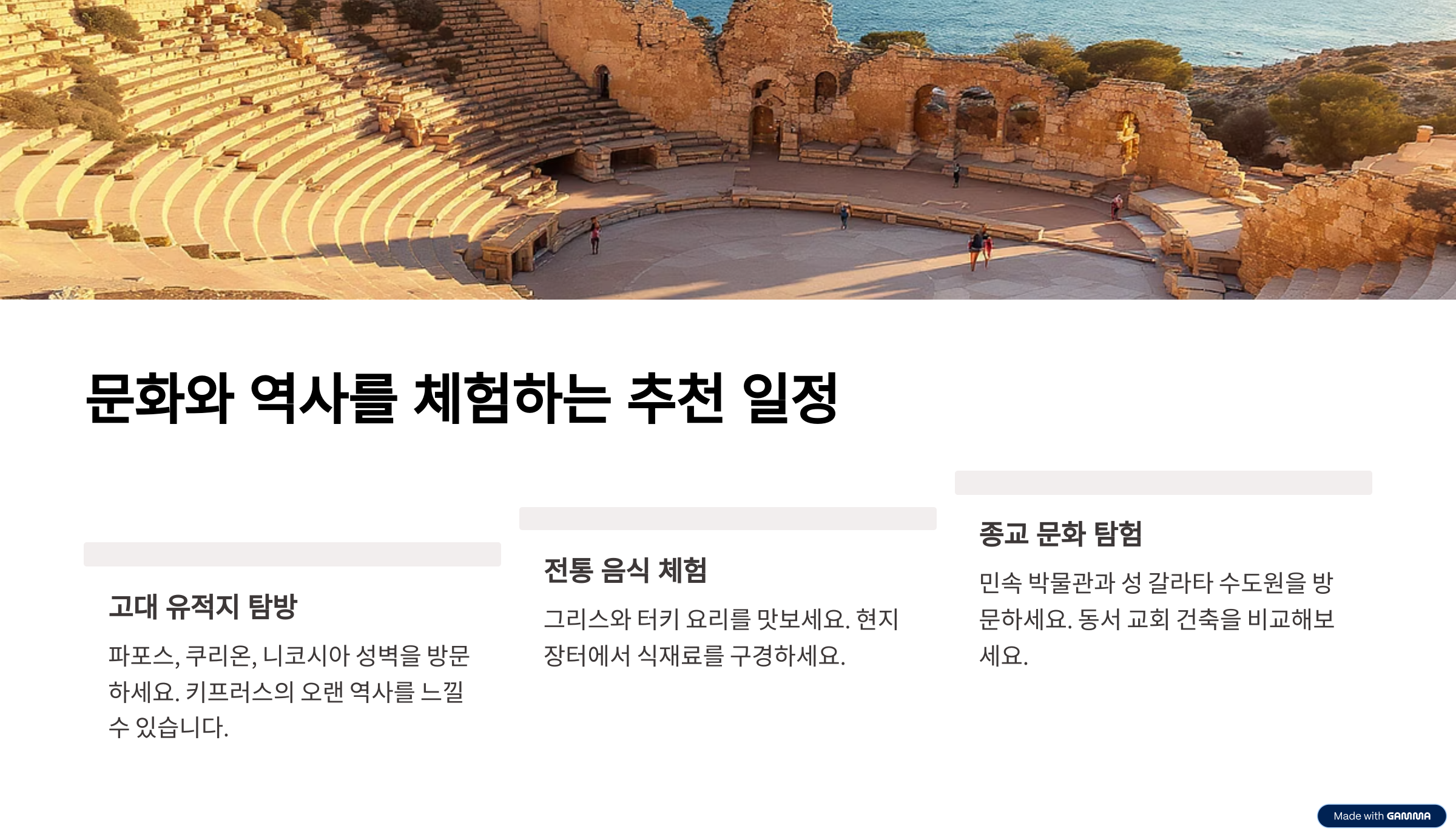 자연과 인간의 흔적이 조화롭게 공존하는 키프러스는, 고대 유적에서 바다 액티비티까지 다채로운 매력을 가지고 있어서 누구나 만족할 수 있는 여행지예요.