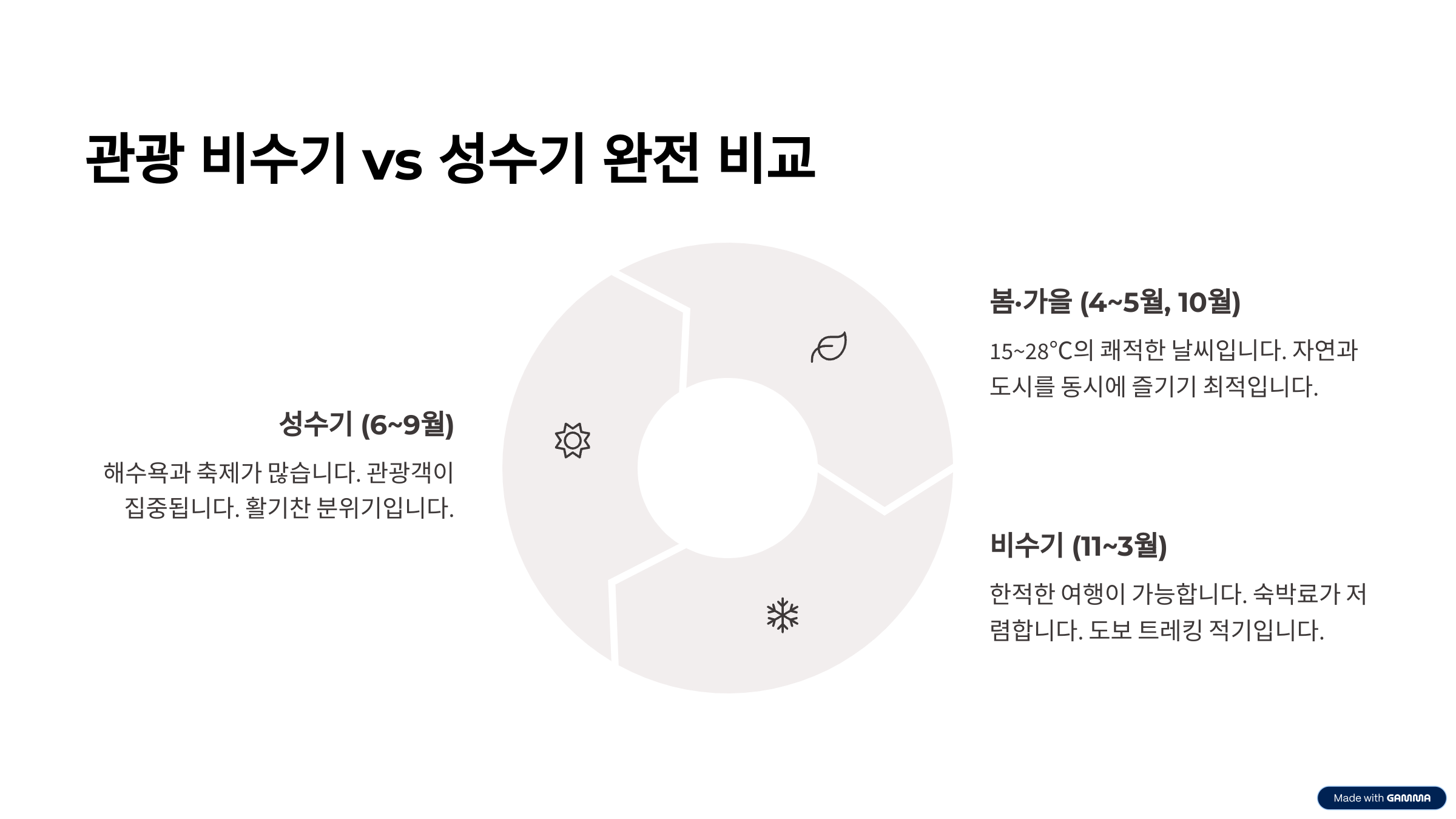 | 11~2월 (비수기) | 조용한 분위기, 저렴한 여행 |