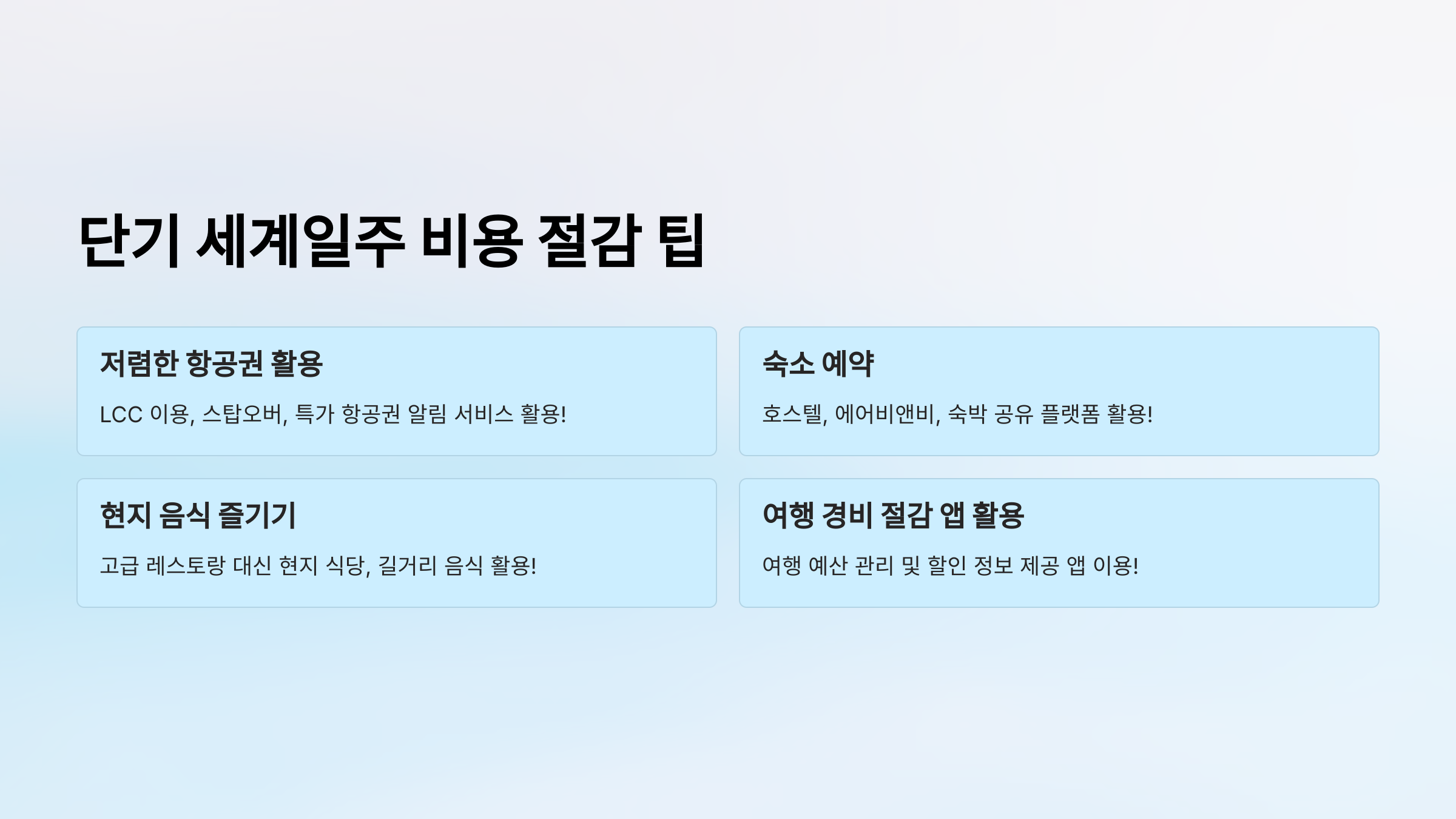 세계일주는 비싸다고 생각하기 쉬운데, 적절한 전략을 사용하면 합리적인 비용으로도 가능해요! 항공권, 숙소, 식비, 교통비까지 절약하는 실전 팁을 소개할게요. ✈️