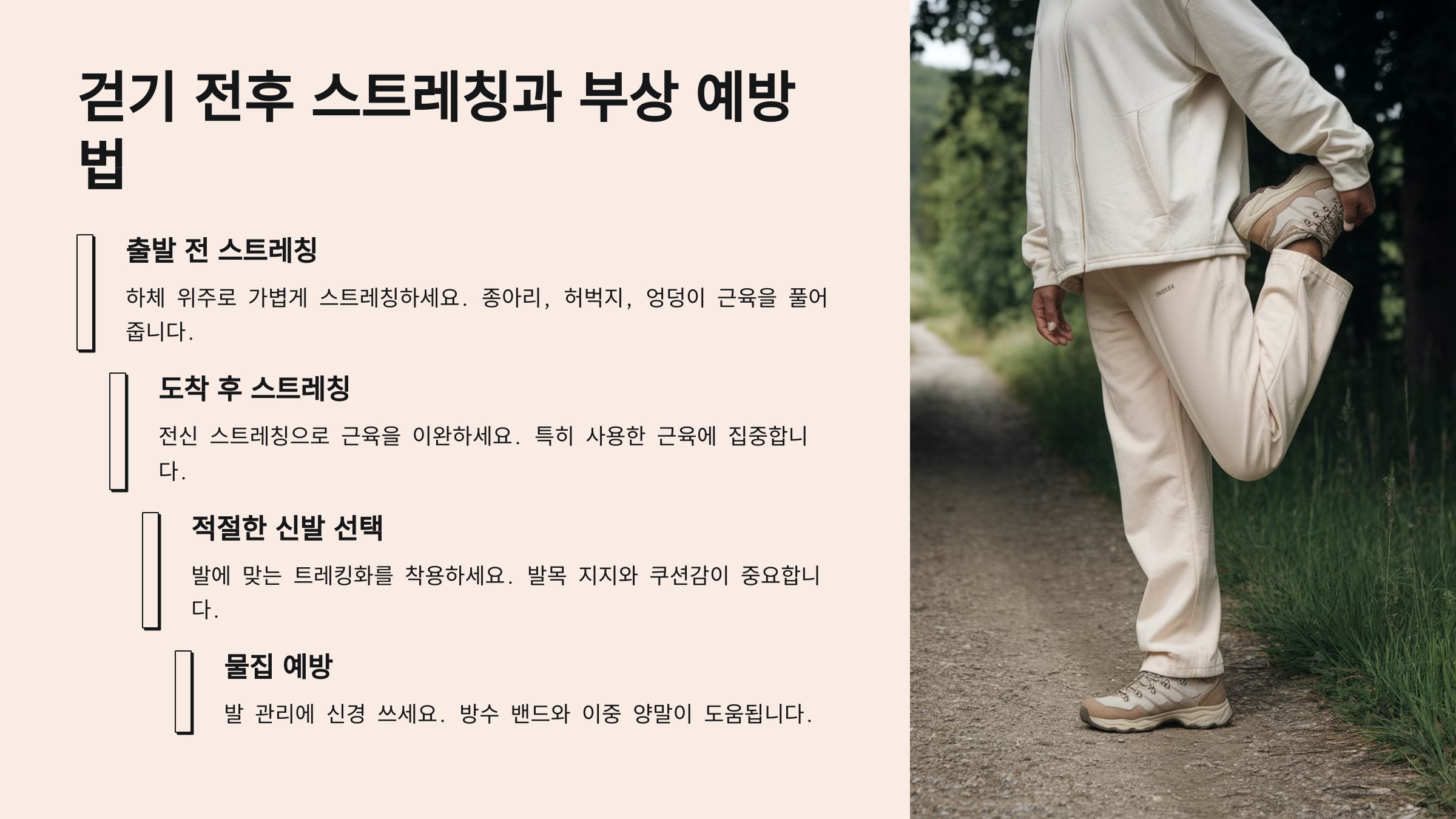 걷기 후에는 **근육이 뭉치지 않도록 스트레칭을 꼭 해주세요!** 부상을 예방하고 체력을 유지하는 것이 장거리 걷기의 핵심이에요. 🚶♀️