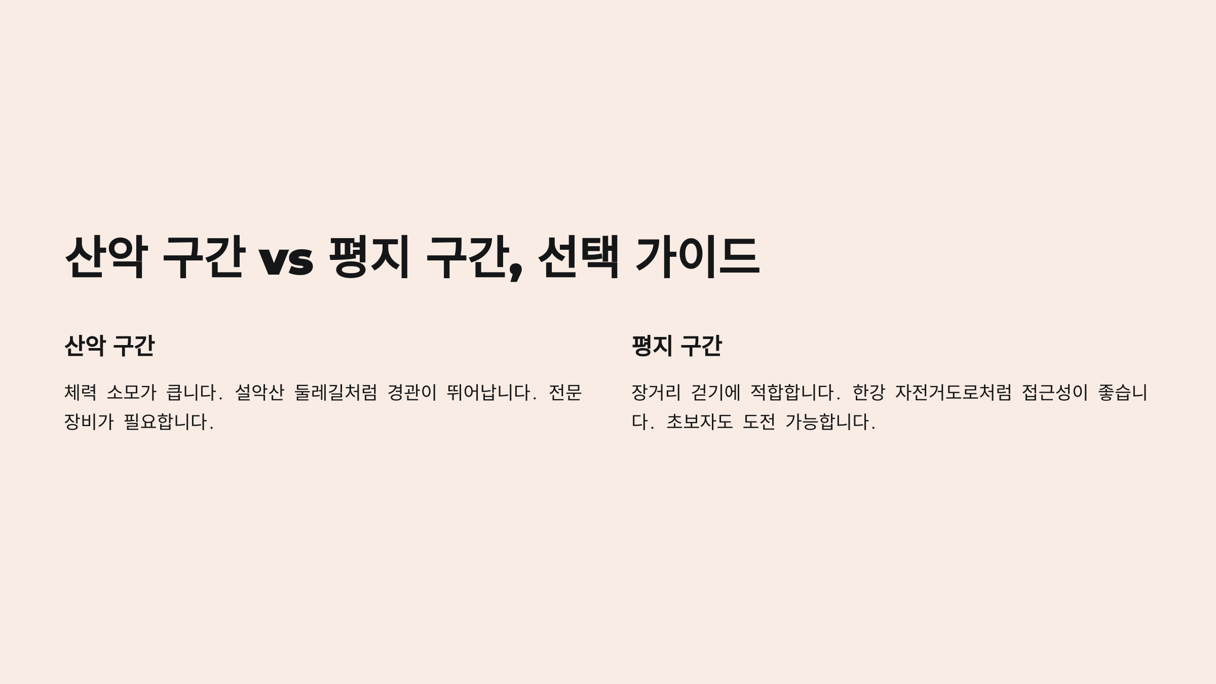 👉 다음은 **산악 구간 vs 평지 구간, 선택 가이드**입니다! 🏔️🏞️