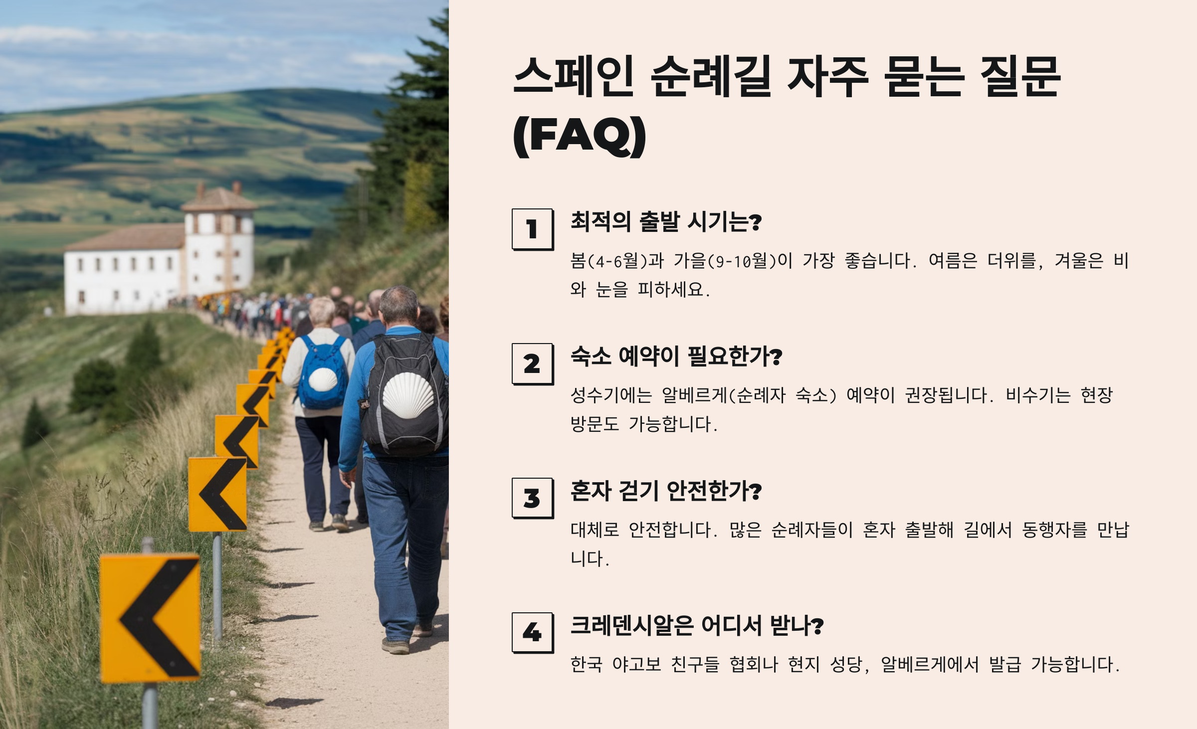 👉 다음은 **스페인 순례길 자주 묻는 질문 (FAQ)**입니다! 🌍