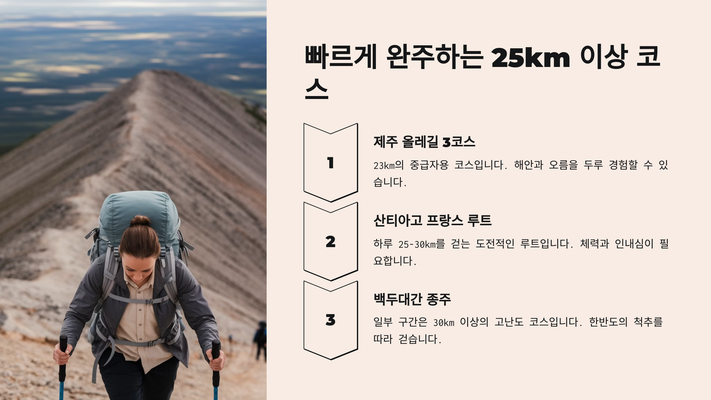 이제 장거리 도보 경험이 있는 사람들을 위한 25km 이상 걷기 코스를 소개할게요.