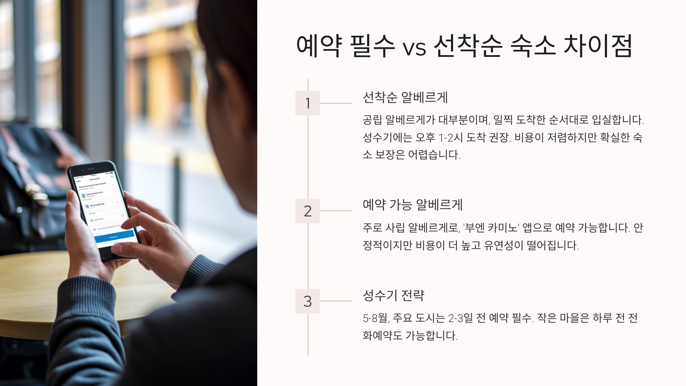 👉 다음은 **예약 필수 vs 선착순 숙소 차이점**입니다! 🏨