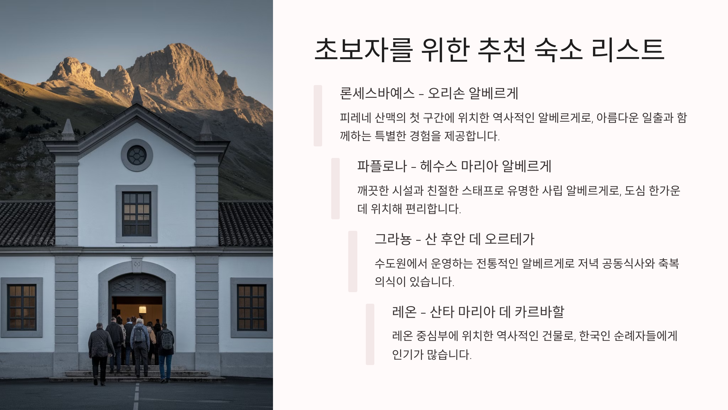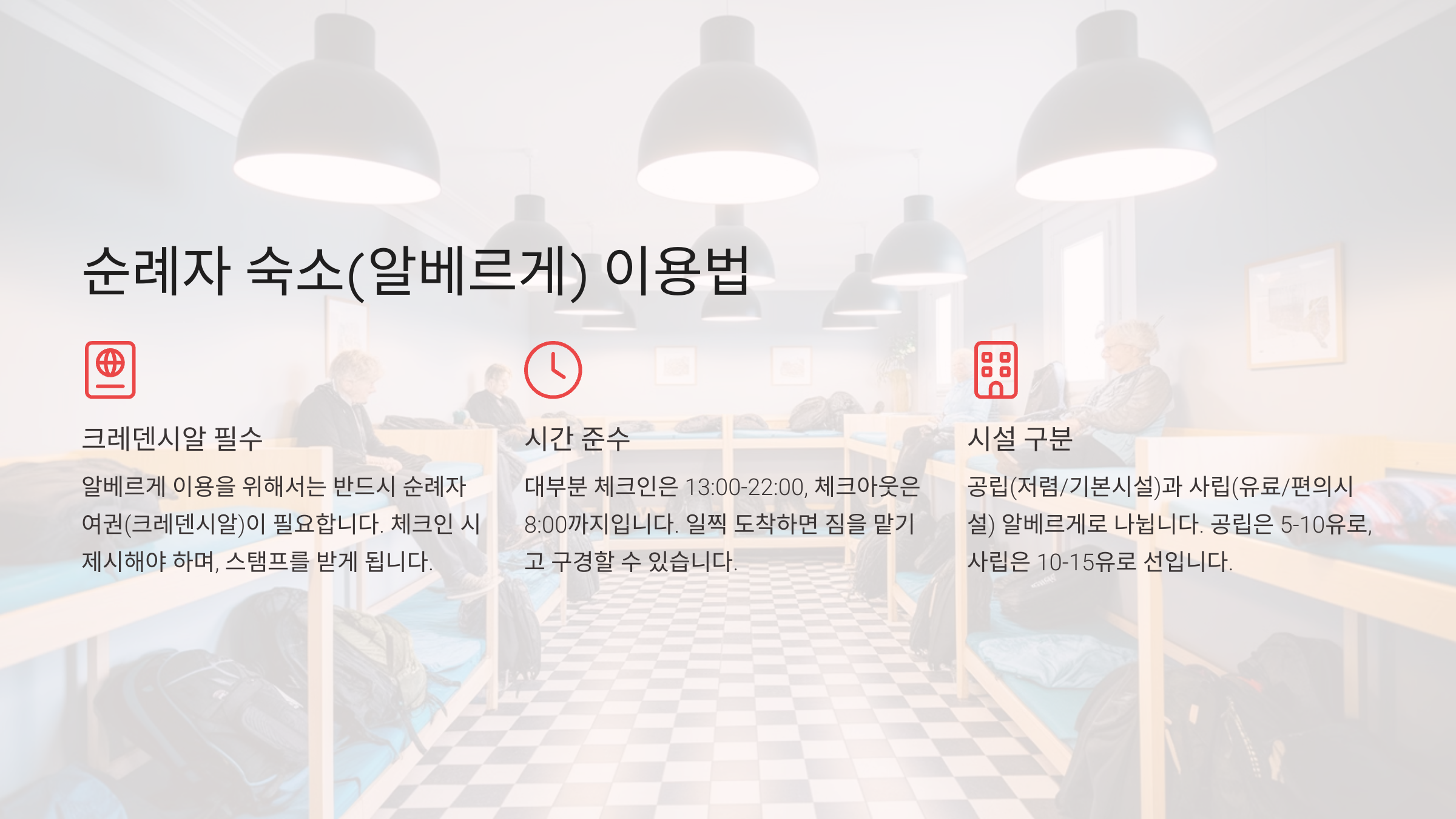 👉 **다음 섹션에서 ‘순례자 숙소(알베르게) 이용법’을 알아볼게요!** 🏡