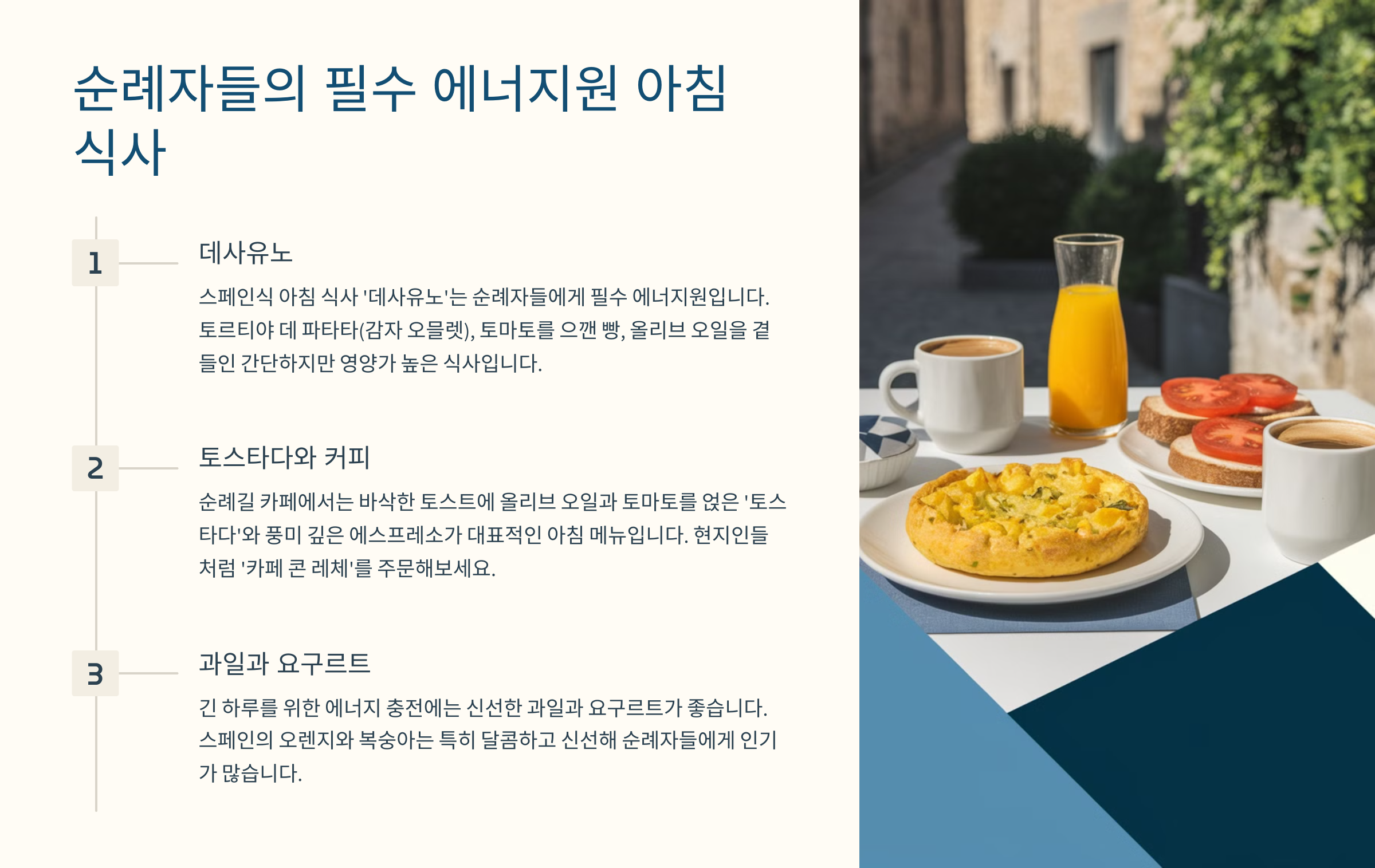 아침 식사는 순례자들에게 가장 중요한 끼니 중 하나예요. 하루 종일 걸어야 하니까 든든한 에너지가 필요하죠. 보통 순례길에서 흔히 볼 수 있는 아침 메뉴는 다음과 같아요.