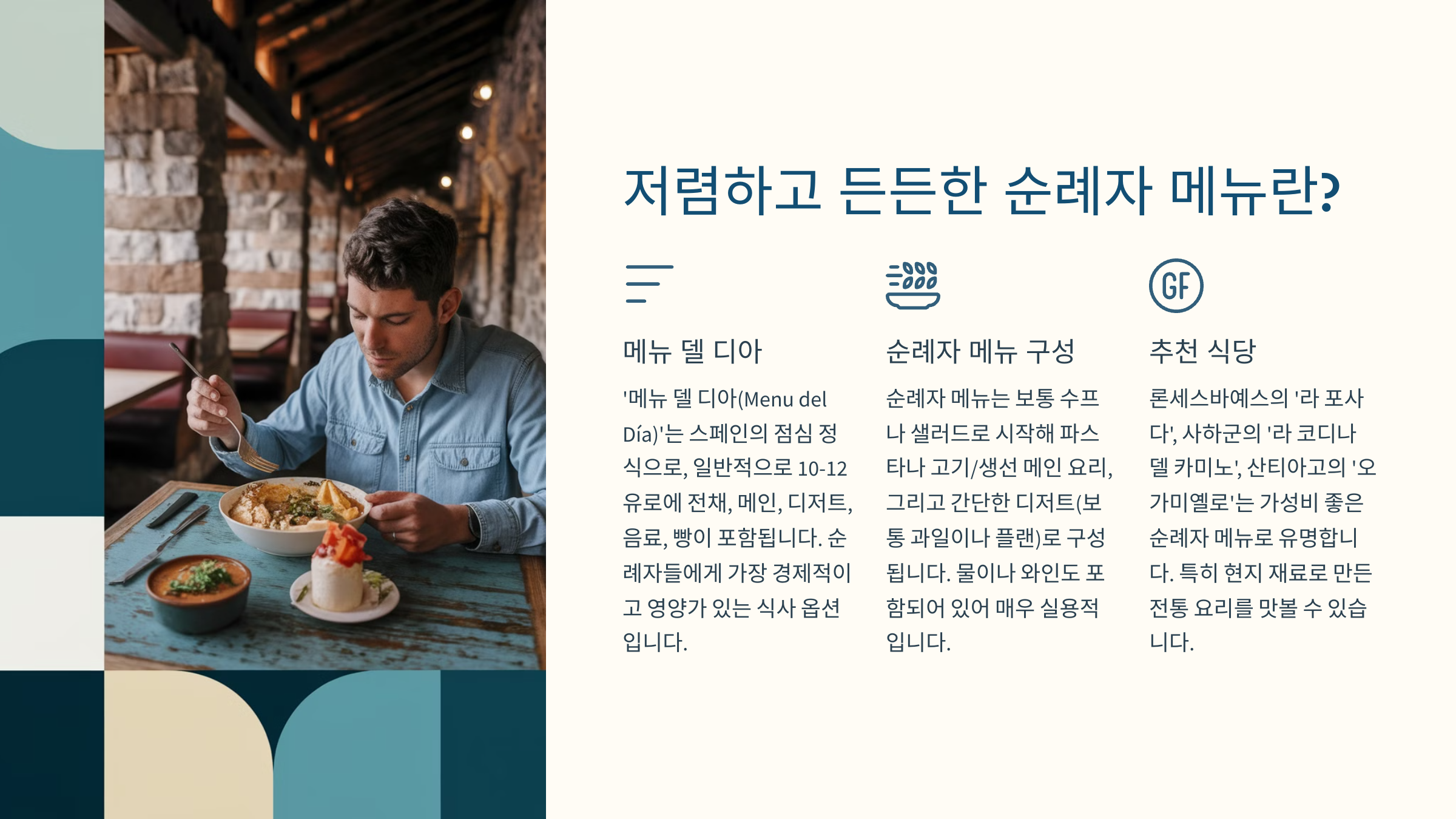 순례길을 걷다 보면 가격이 부담되지 않으면서도 든든한 한 끼가 필요할 때가 많아요. 이럴 때 **"메누 델 페레그리노(Menu del Peregrino)"**, 즉 ‘순례자 메뉴’가 완벽한 선택이 될 수 있어요! 💰✨