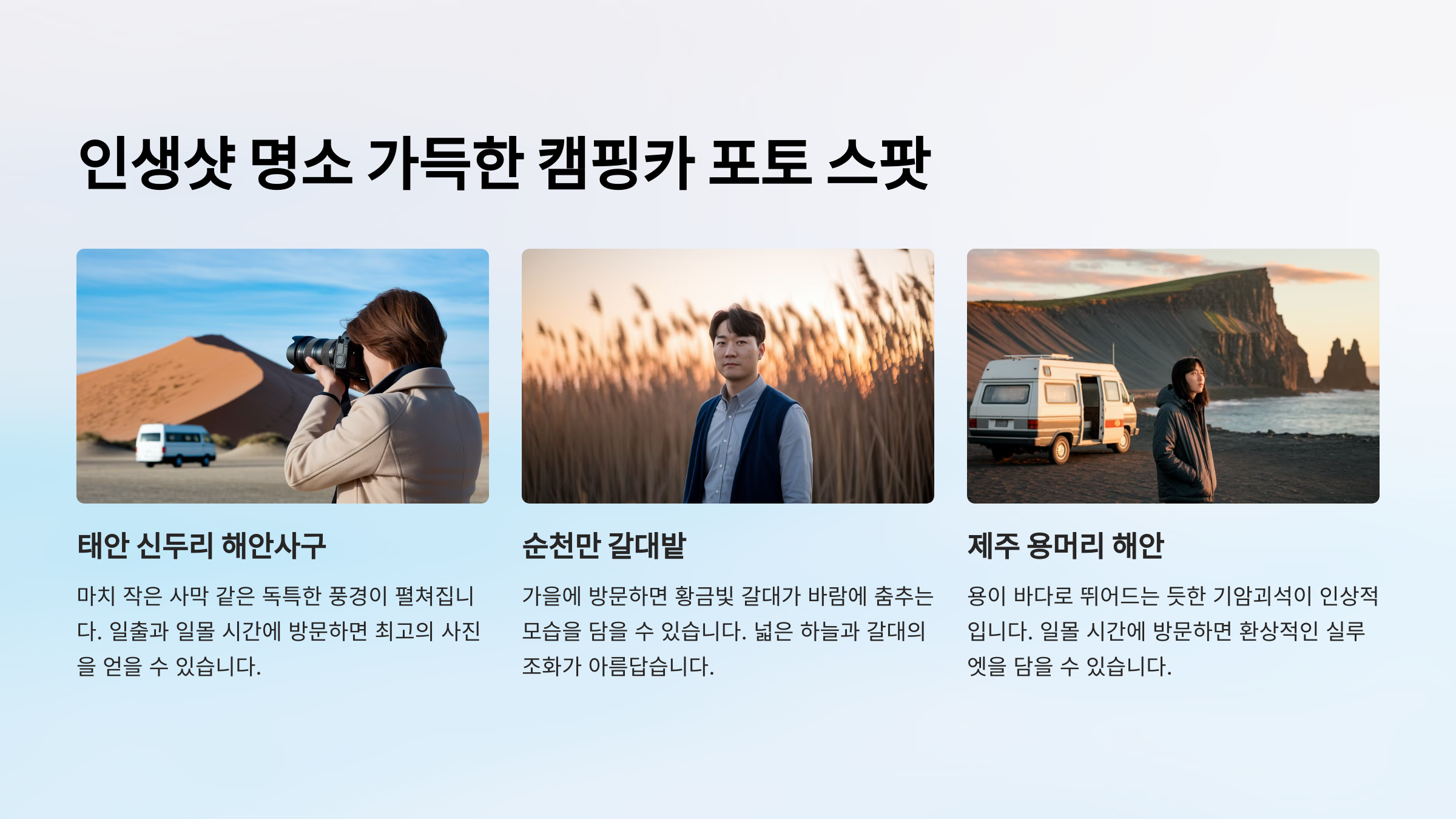 바다와 어우러진 감성적인 포토존부터, 산속에서 자연을 그대로 담아낼 수 있는 장소까지! 캠핑카와 함께하면 더 특별한 추억을 남길 수 있는 곳들을 소개할게요. 🌅