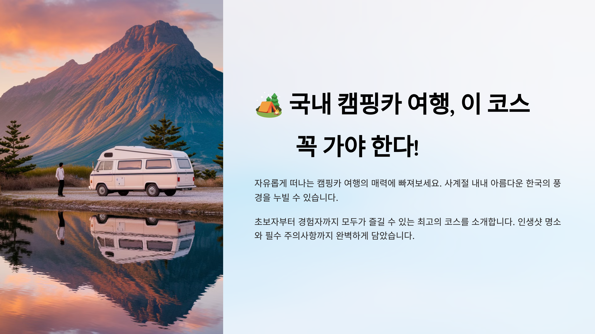 캠핑카 여행은 자유로운 일정과 감성적인 분위기를 즐길 수 있어 매력적인 여행 방식이에요. 🏕️ 특히 국내에는 캠핑카로 떠나기 좋은 멋진 여행지가 많답니다!