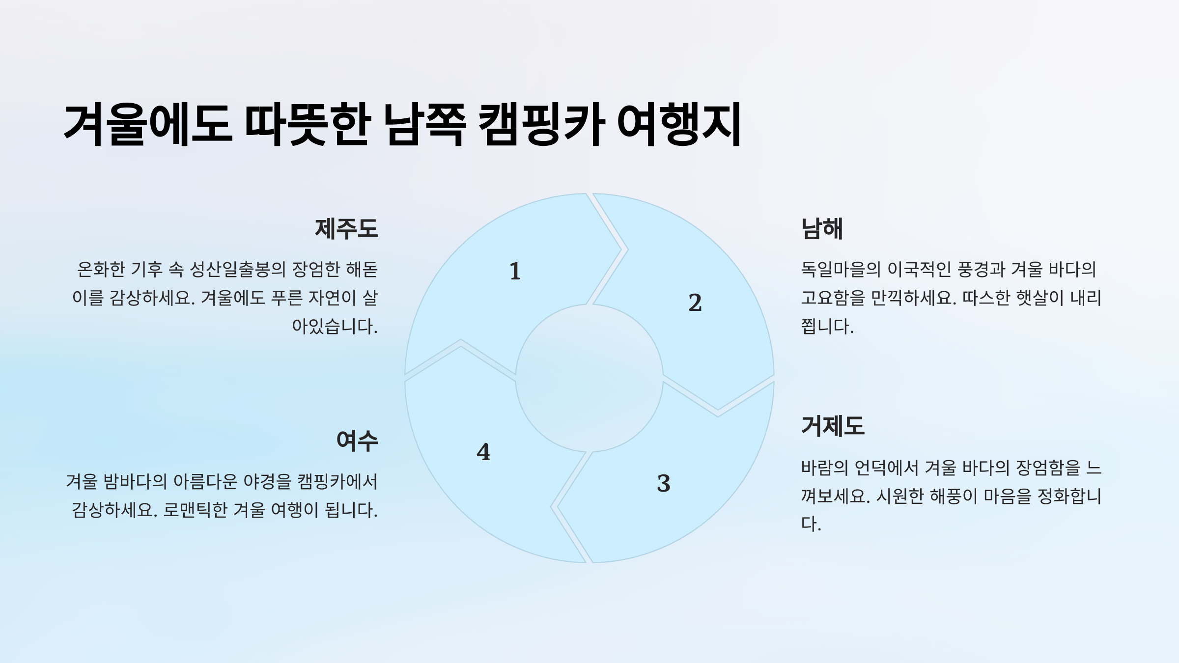 부산, 제주, 여수 같은 남쪽 지역은 겨울에도 비교적 따뜻한 기온을 유지하기 때문에 동계 캠핑카 여행에 제격이에요. 특히 제주도는 겨울 바다와 함께 온천, 감귤 따기 체험까지 가능해 더욱 특별한 여행이 될 거예요! 🚐🍊