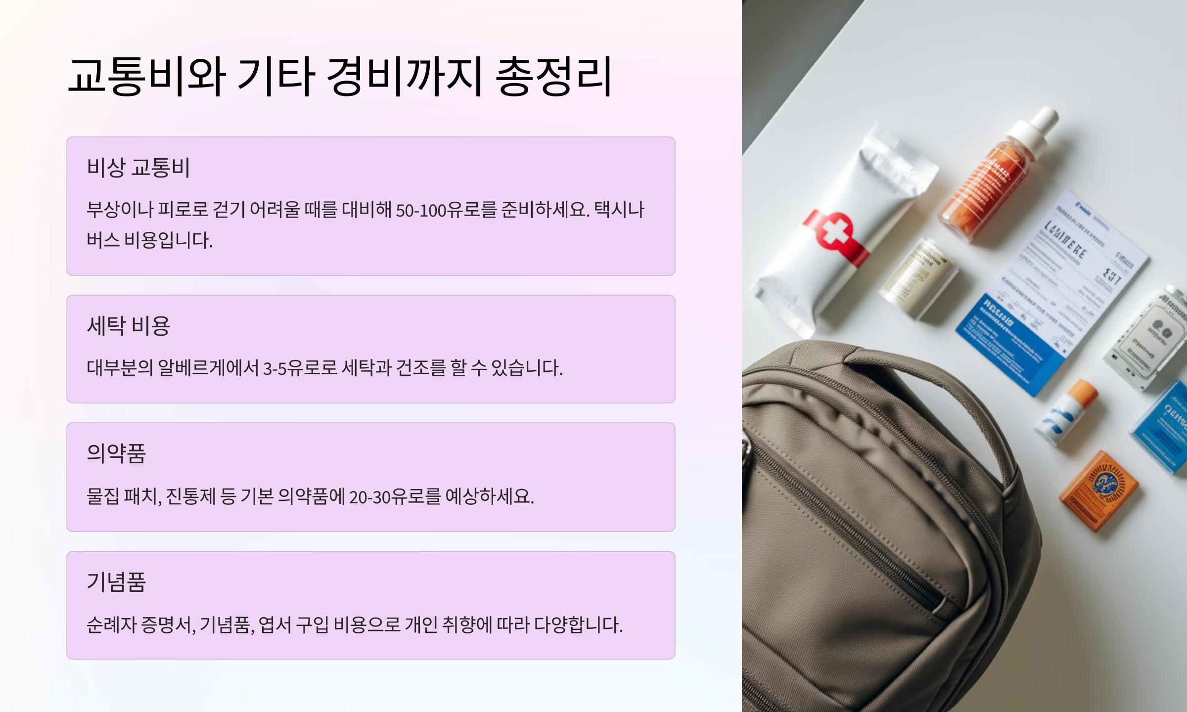 교통비와 기타 경비를 미리 계산해두면 불필요한 지출을 줄일 수 있어요! 다음은 예상치 못한 추가 비용 대비 방법을 알아볼까요? 💸
