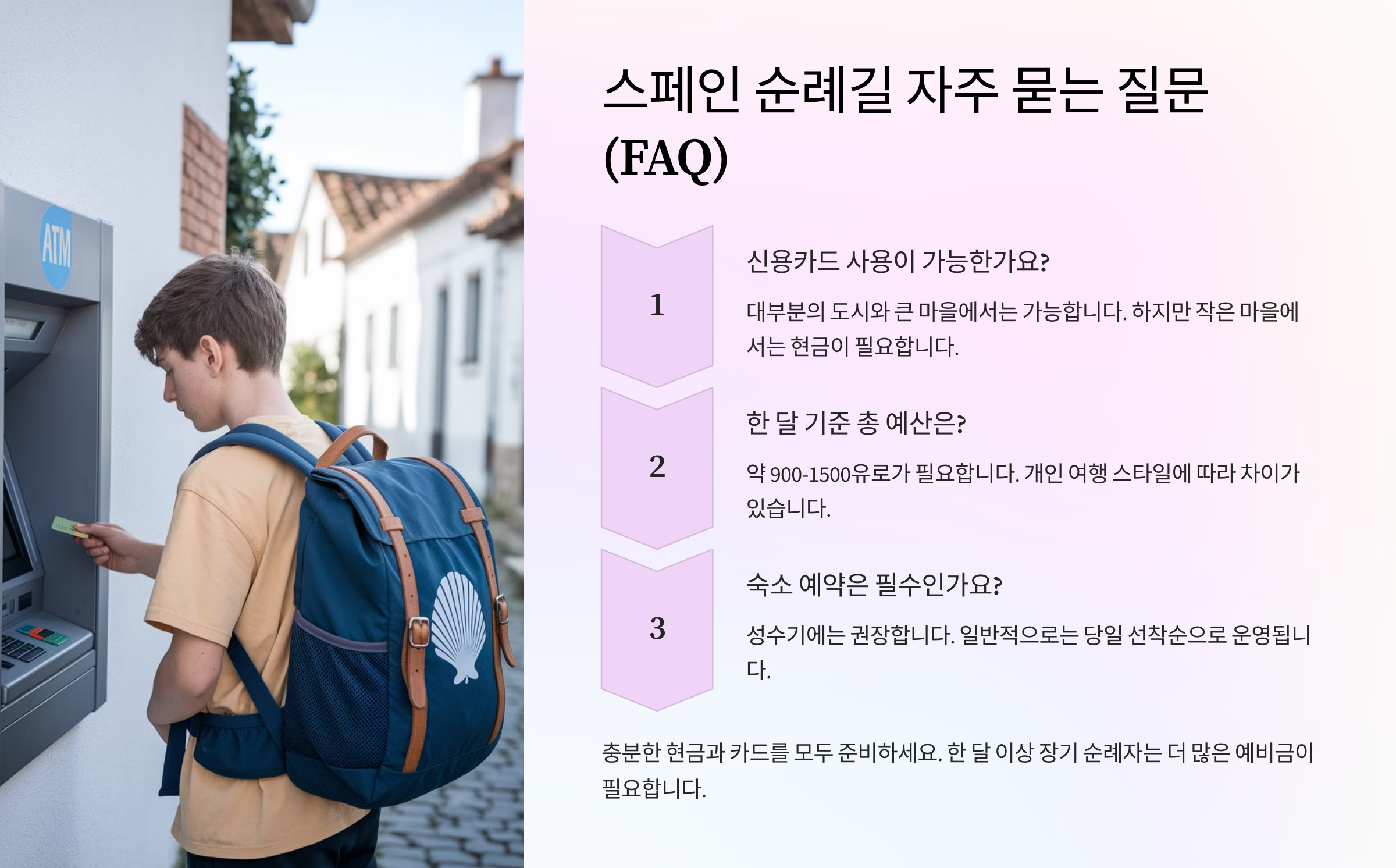 알뜰하게 여행하면서도 순례길을 충분히 즐길 수 있어요! 이제, 많은 분들이 궁금해하는 순례길 FAQ를 알아볼까요? 🤔