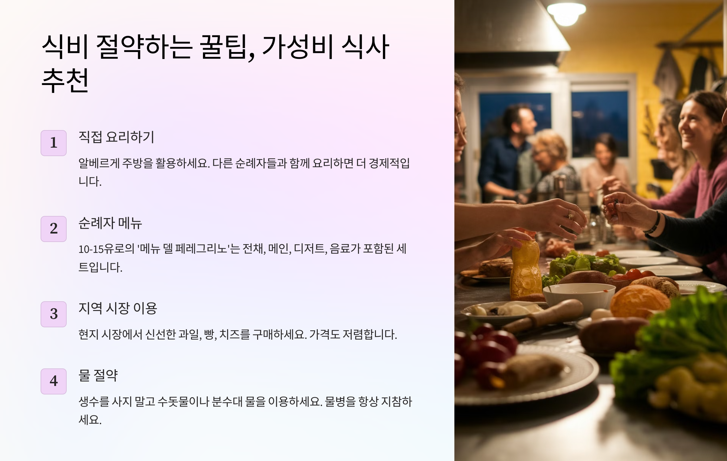 | 다른 순례자와 공유 | 공동 장보기 및 요리로 비용 절약 |