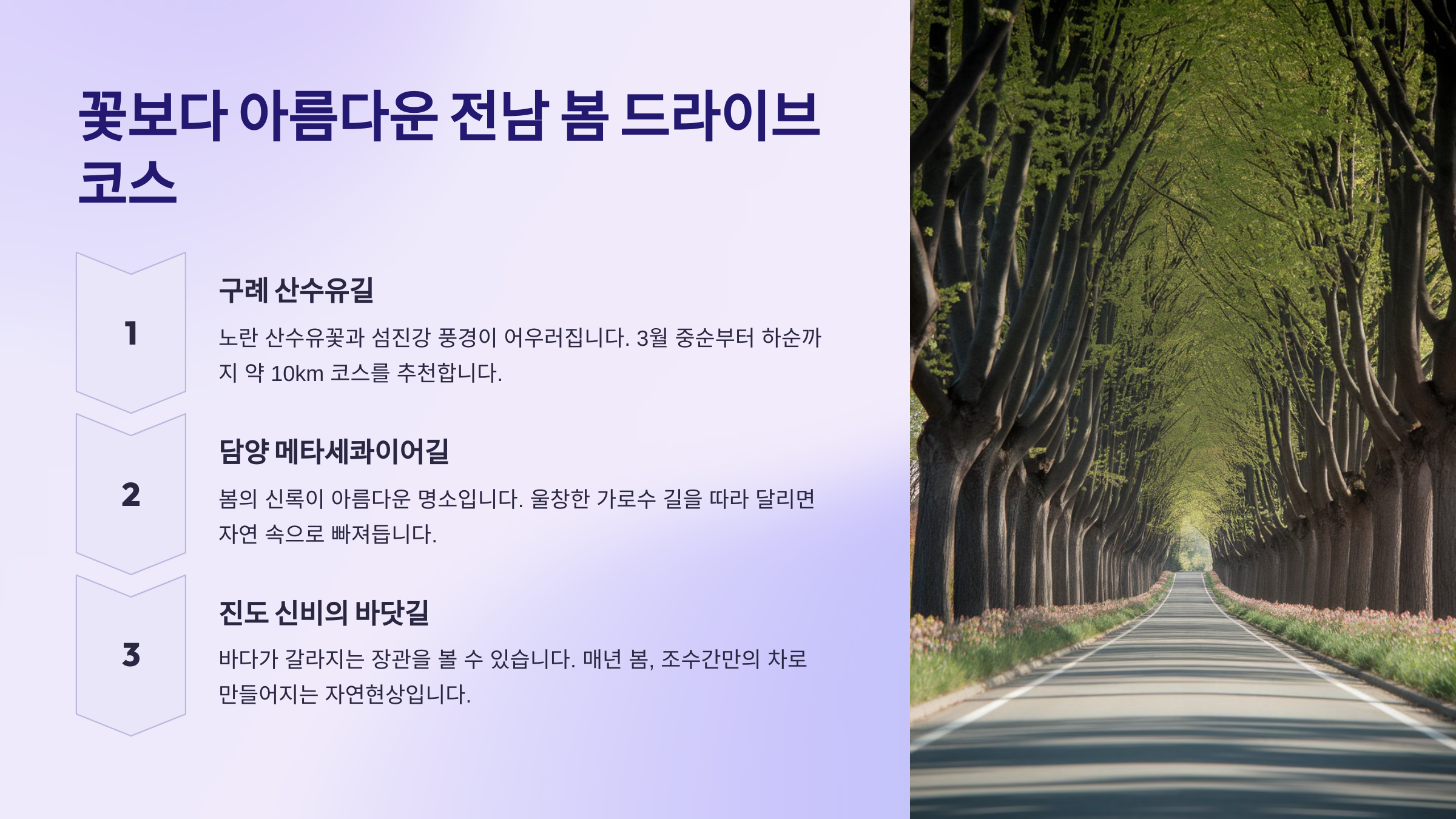 🚗 다음은 꽃보다 아름다운 전남의 봄 드라이브 코스를 소개할게요!