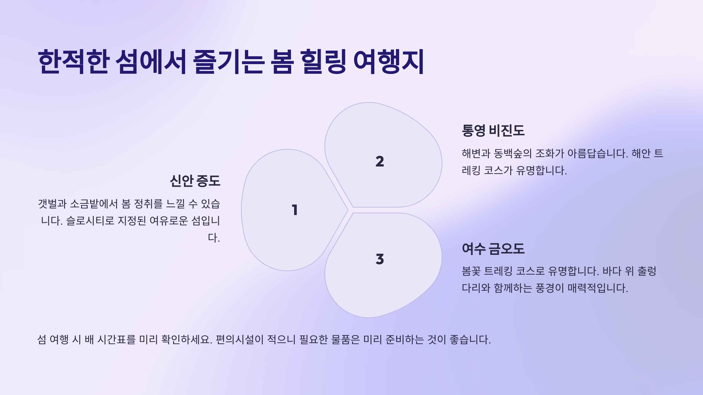 🏝️ 다음은 한적한 섬에서 즐기는 봄 힐링 여행지를 소개할게요!