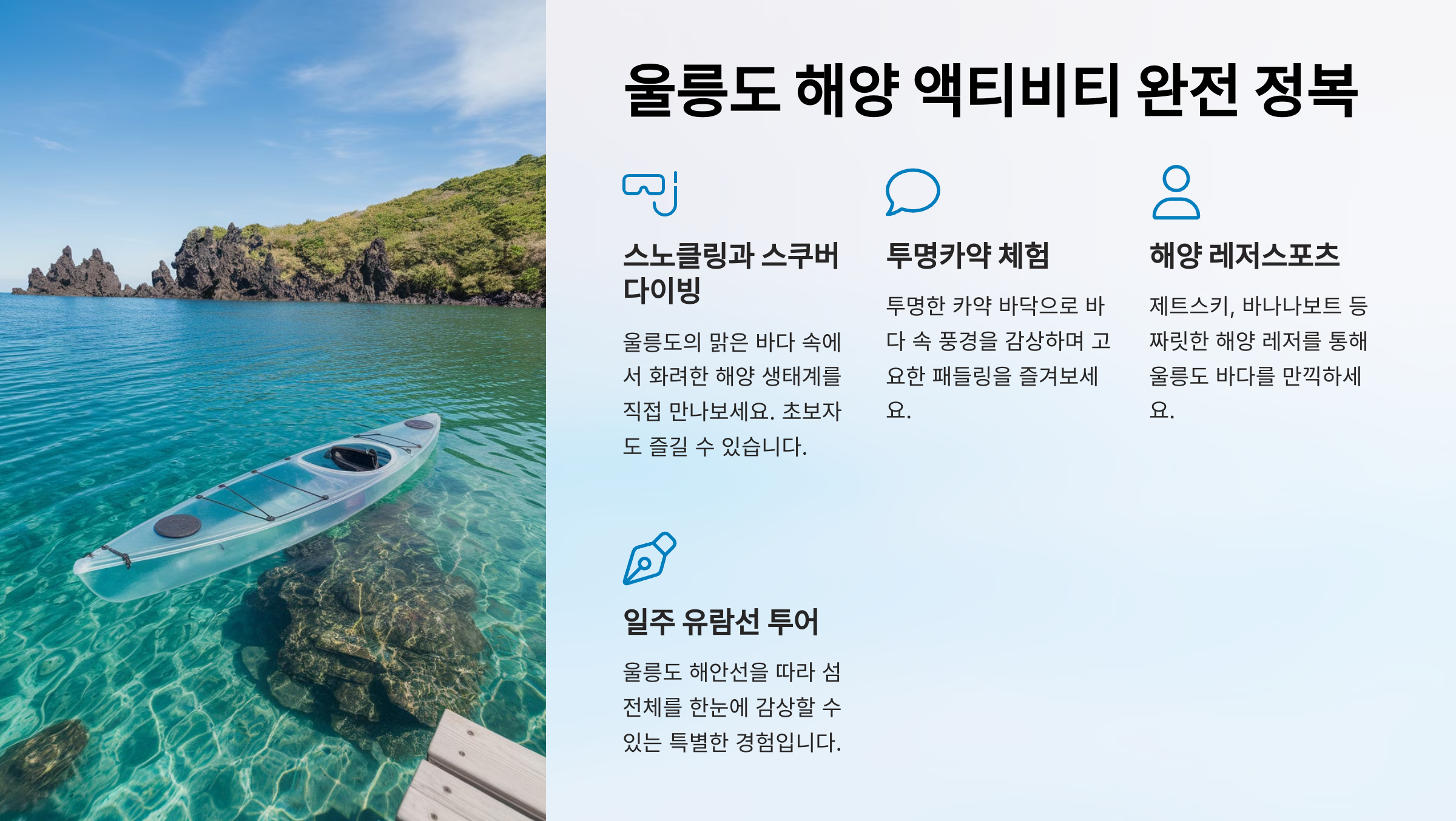 👉 다음 섹션인 **"울릉도 해양 액티비티 완전 정복"** 자동 출력됩니다! 🌊
