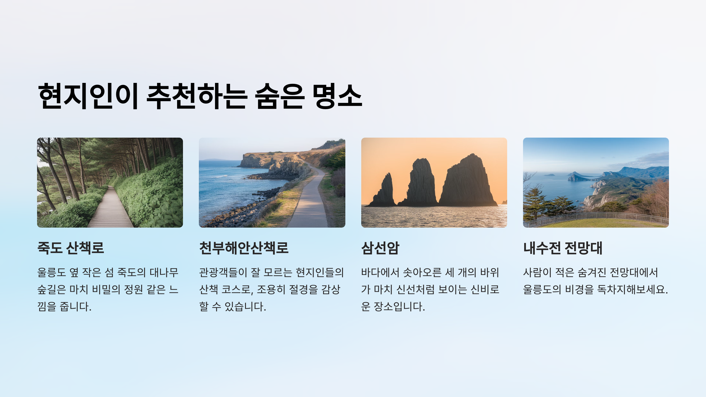 이런 숨은 명소들은 관광객이 많지 않아 조용하게 여행을 즐기기에 좋아요. 울릉도를 더욱 깊이 있게 경험하고 싶다면 꼭 들러보세요! 😊