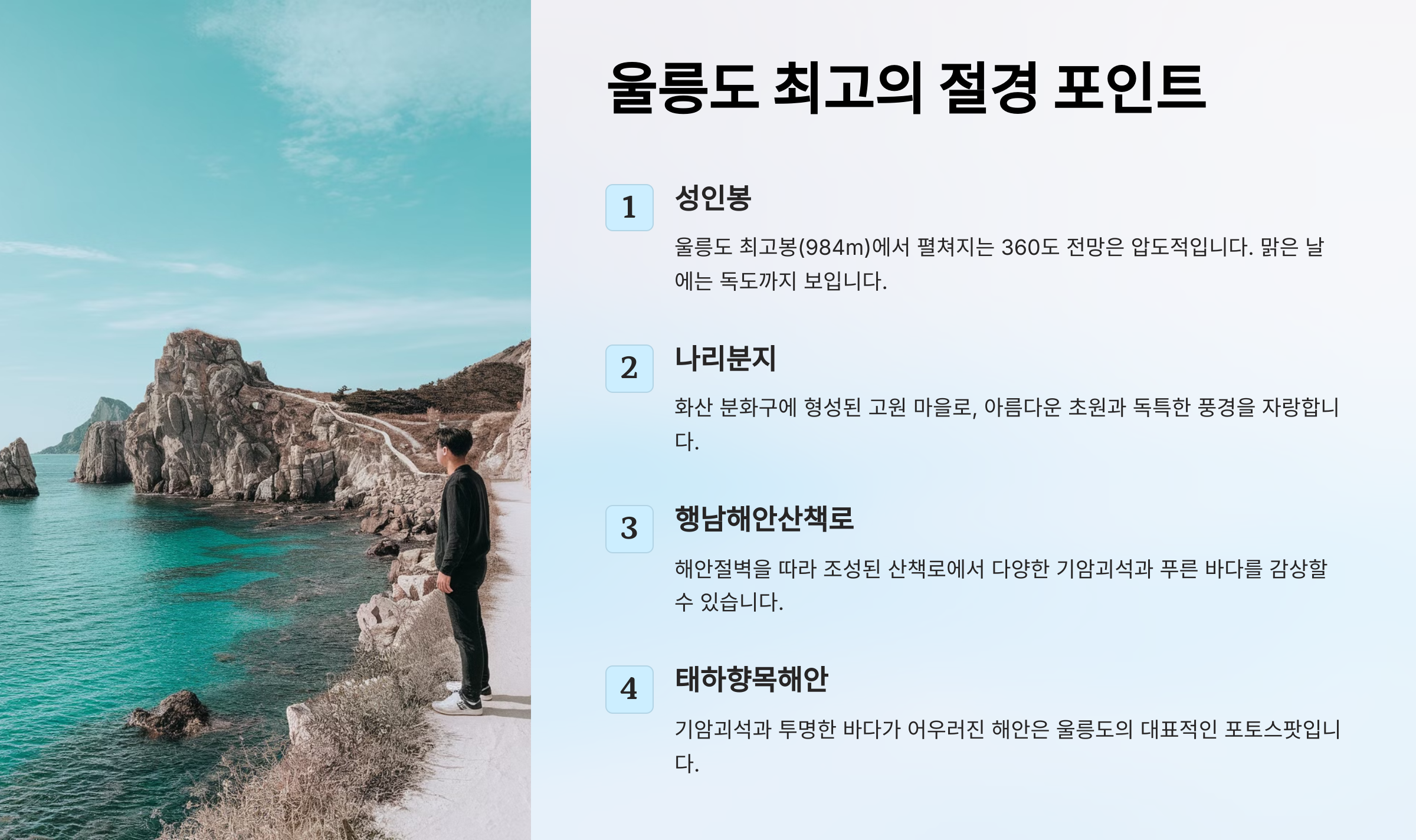 이제 본격적으로 울릉도의 매력을 하나씩 살펴볼까요? 🌊