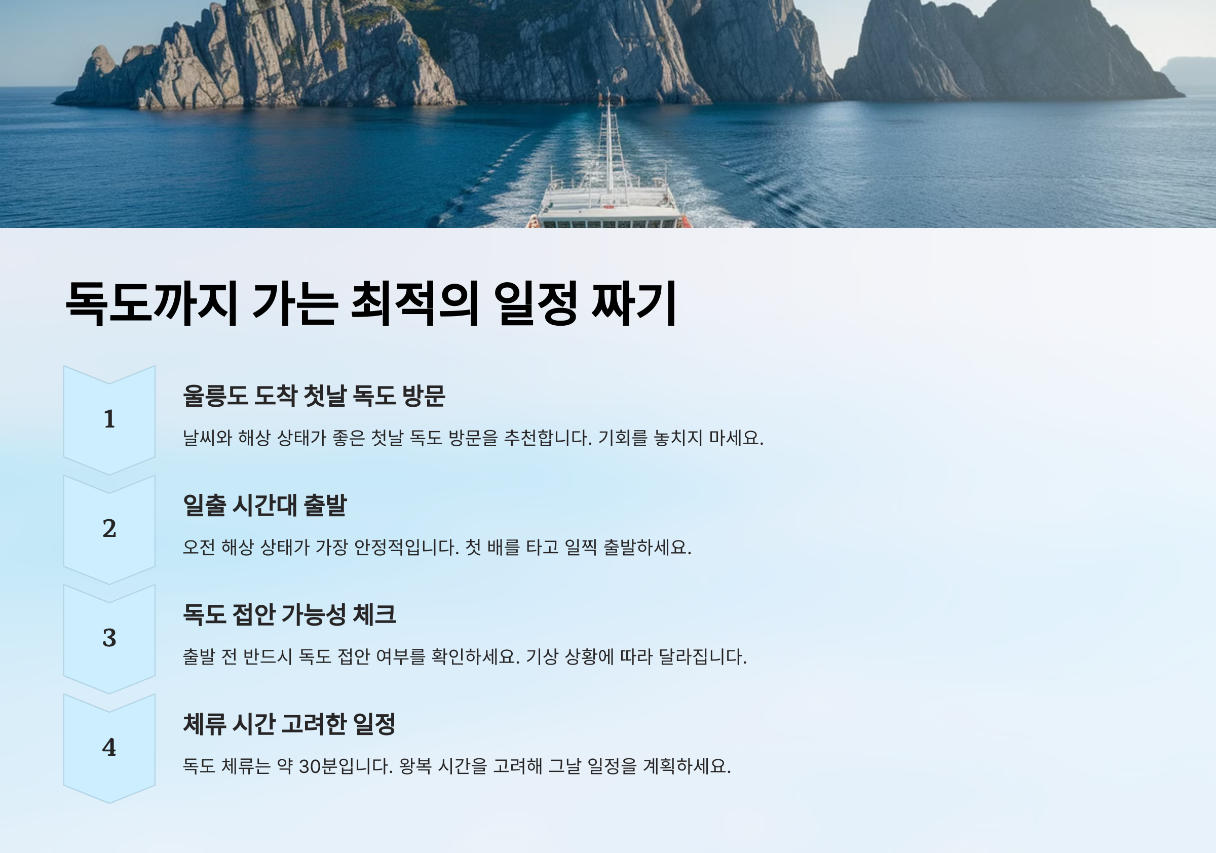 ✔️ **기상 상황 체크** – 독도행 배는 날씨 영향을 많이 받아요. 출발 전날과 당일 아침에 반드시 확인하세요!