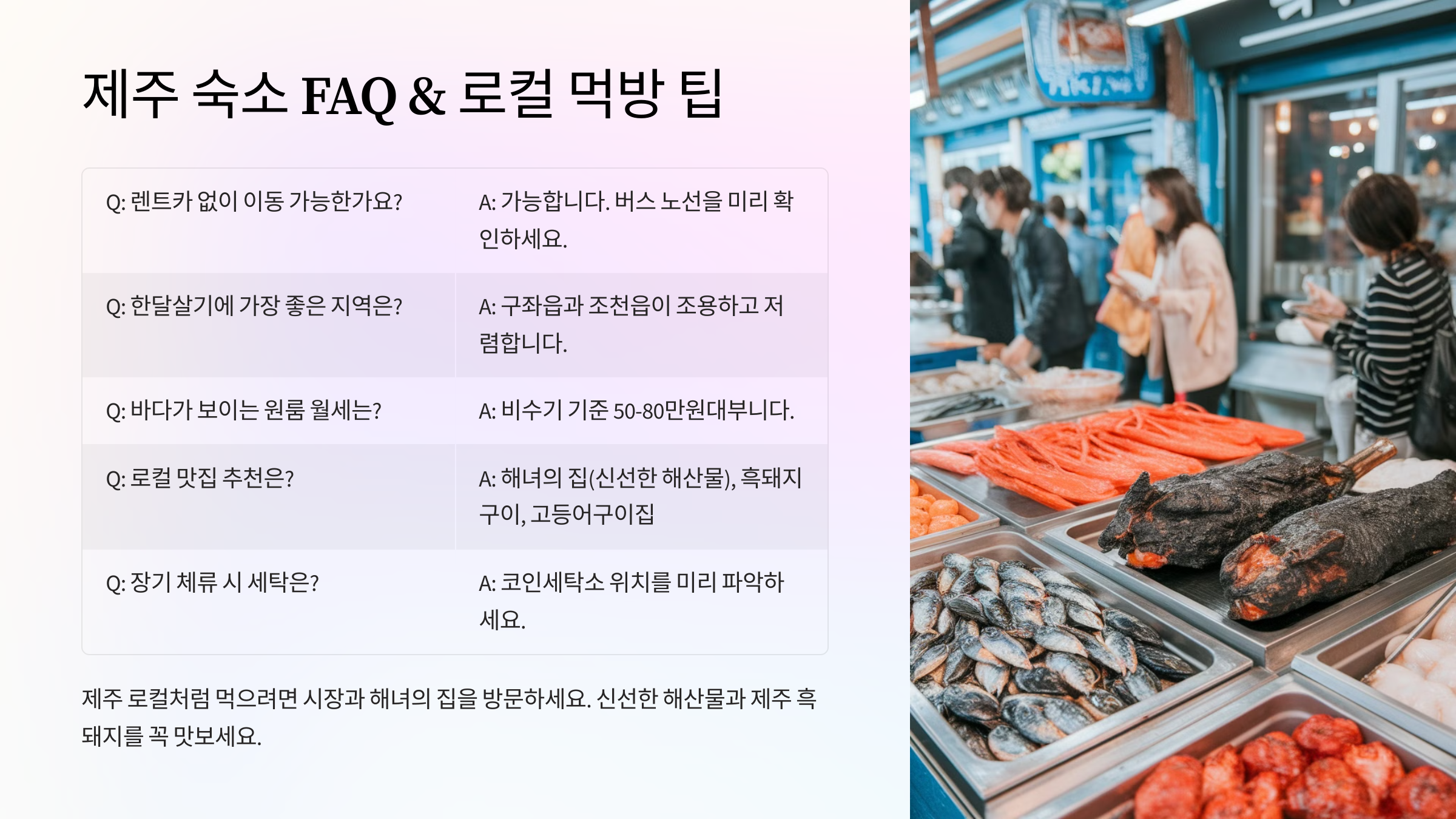 다음 섹션에서는 제주 숙소 관련 자주 묻는 질문 (FAQ)을 정리해드릴게요! 📢