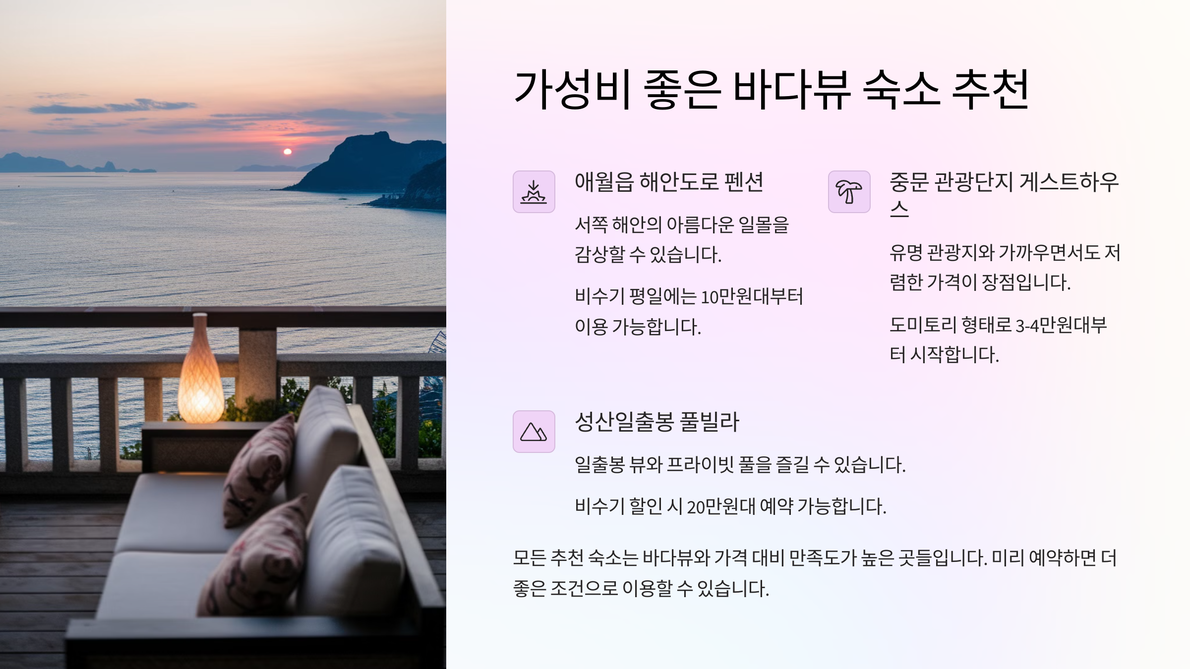다음 섹션에서는 바다뷰 숙소? 가격 대비 괜찮은 곳 추천을 알려드릴게요! 🌊🏨