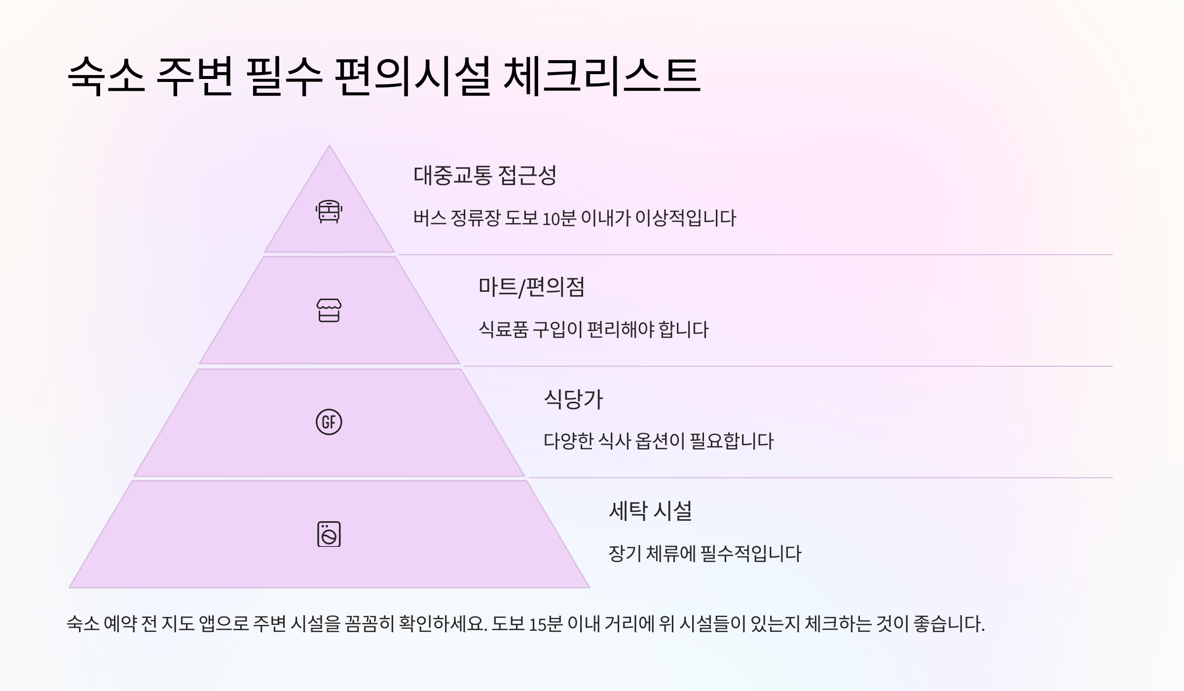 숙소를 예약할 때 가장 중요한 요소 중 하나는 주변 편의시설이에요. 특히 장기 숙박을 계획하고 있다면 식당, 마트, 병원, 대중교통 등의 접근성을 꼼꼼히 확인하는 것이 좋아요.