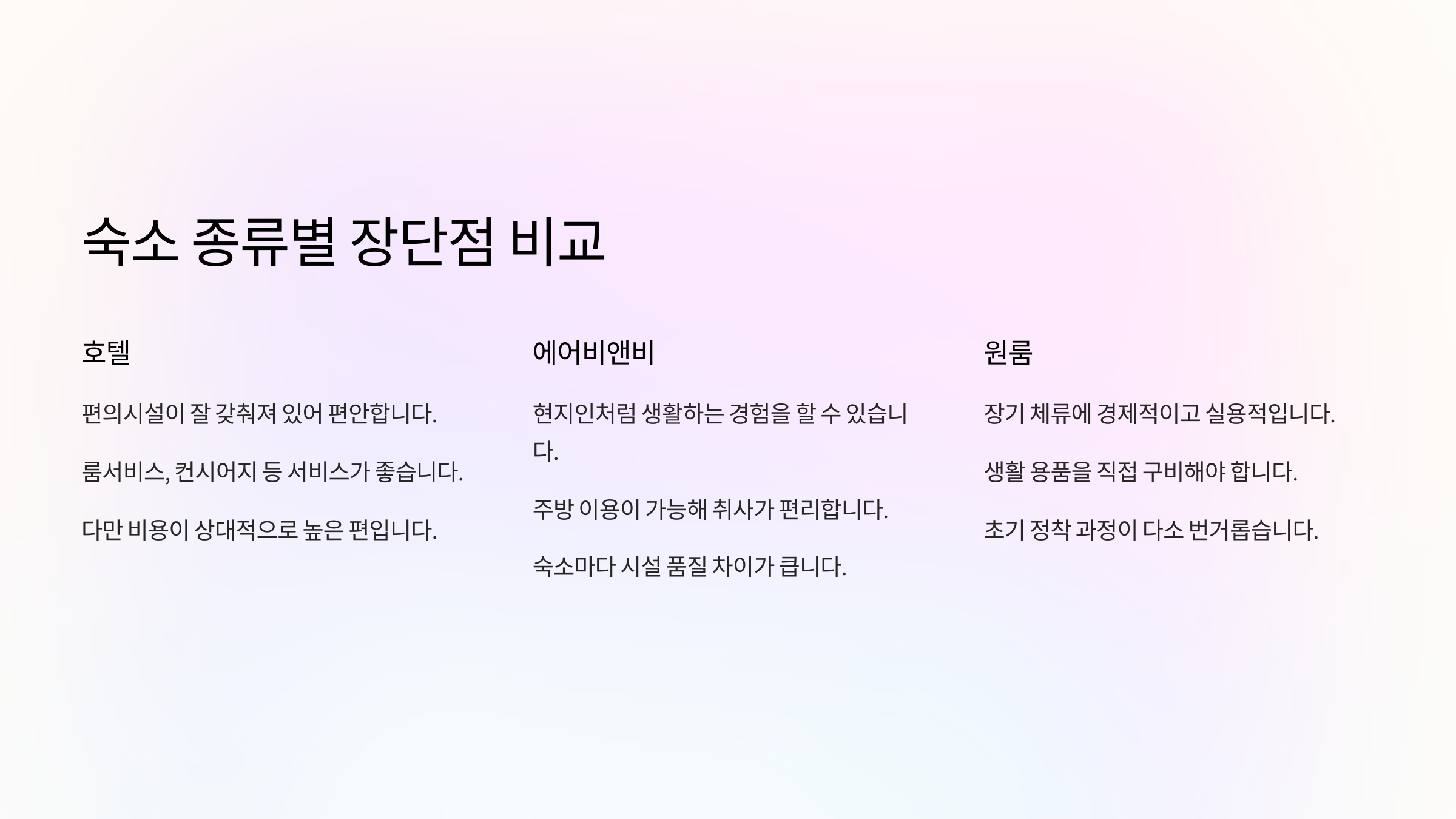숙소 종류별 장단점 비교 (호텔, 에어비앤비, 원룸) 🏨🏡🏠