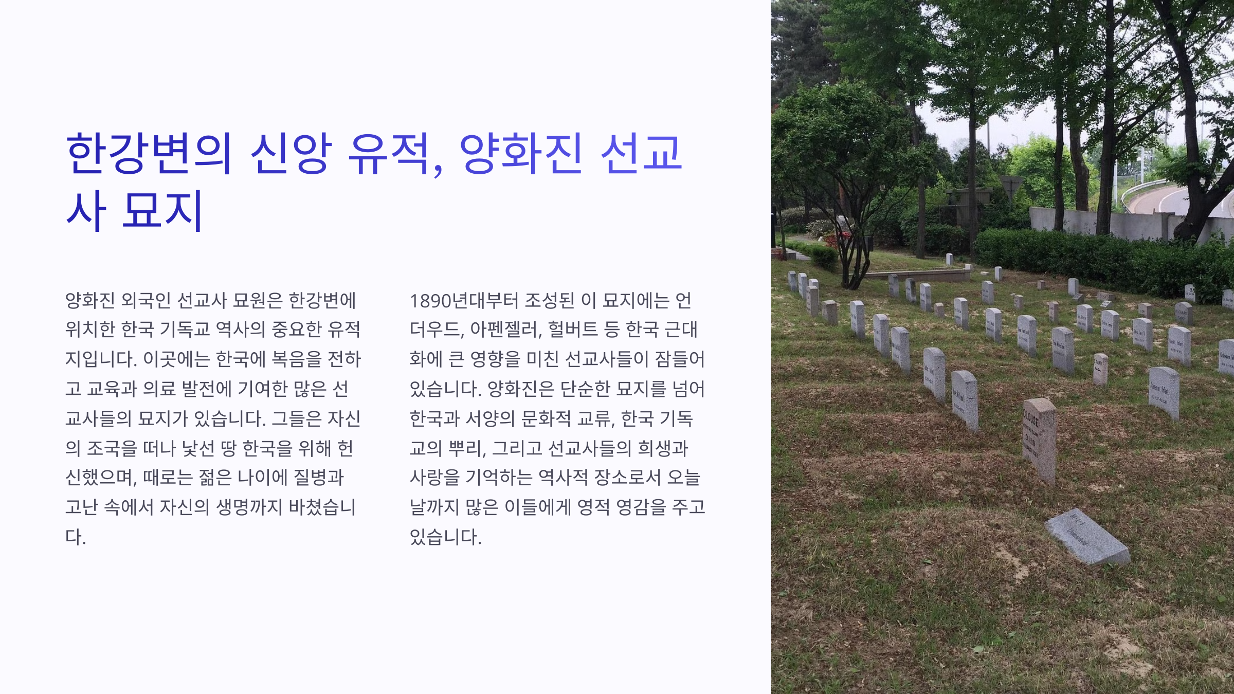 다음 섹션에서는 한강변의 신앙 유적, 양화진 선교사 묘지를 소개해드릴게요! 🌳⛪