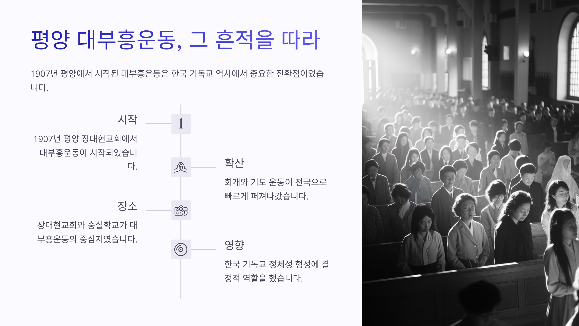 다음 섹션에서는 평양 대부흥운동, 그 흔적을 따라를 소개해드릴게요! 🔥⛪
