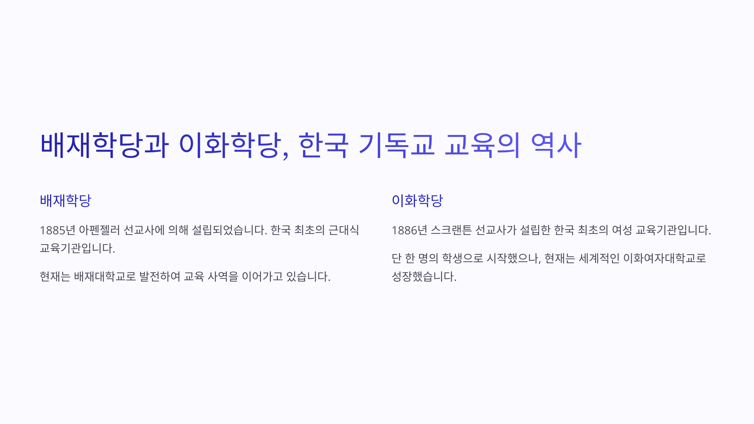 다음 섹션에서는 배재학당과 이화학당, 한국 기독교 교육의 역사를 소개해드릴게요! 🏫📖