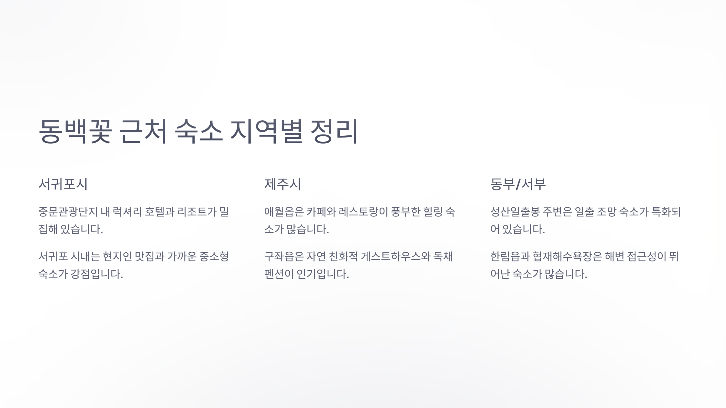 | 지역 | 대표 동백 명소 | 추천 숙소 유형 | 숙소 장점 |