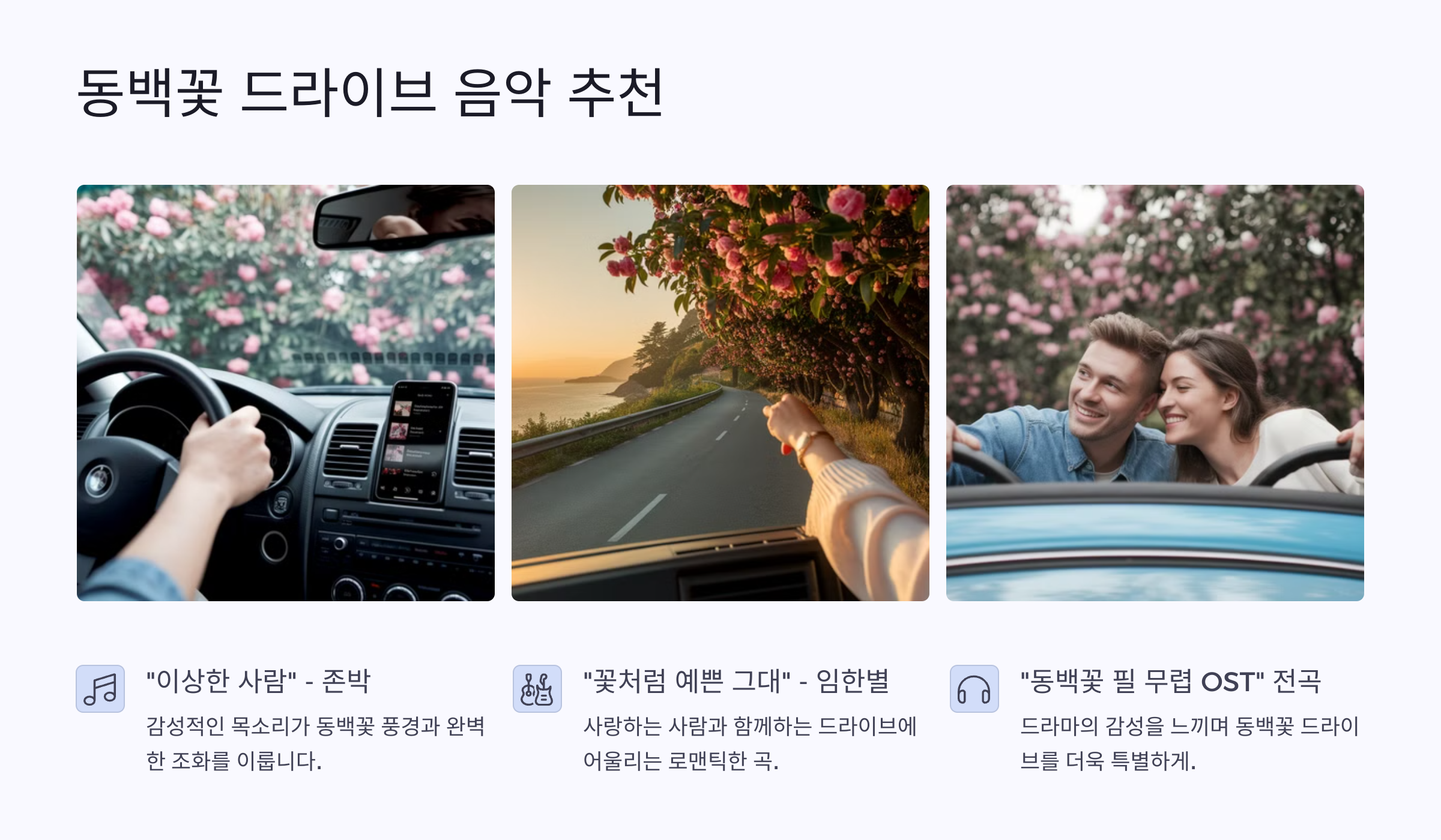 풍경 좋은 드라이브에는 감성 가득한 음악이 빠질 수 없죠! 동백꽃 드라이브에는 계절과 분위기에 어울리는 따뜻하고 몽글몽글한 선곡이 제격이에요. 창문을 살짝 열고 바람을 맞으며 들으면 여행이 더 특별해지죠.