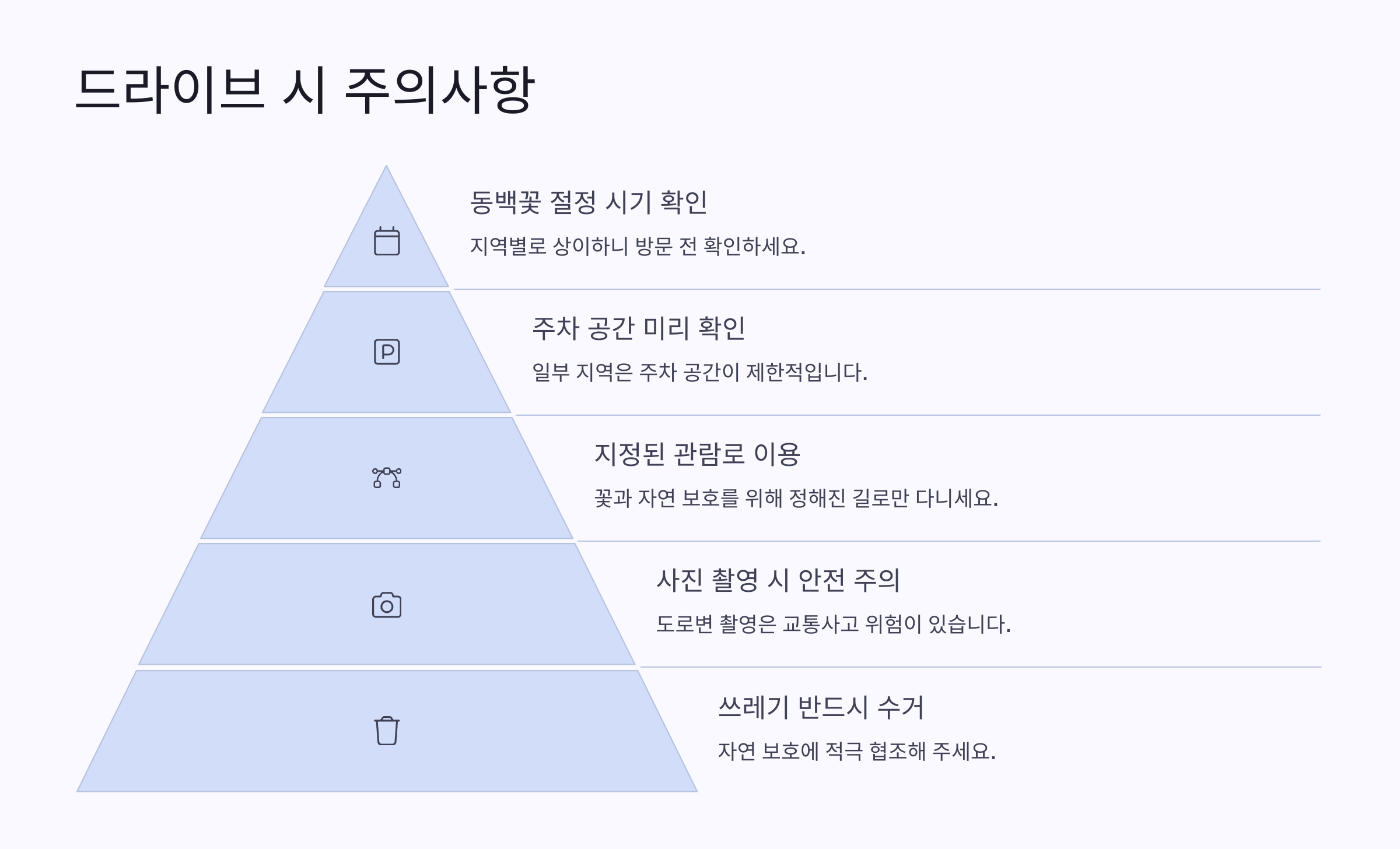 동백꽃 드라이브는 경치에 집중하다 보면 운전에 소홀해질 수 있어서 몇 가지 유의할 점을 꼭 챙기는 게 좋아요. 특히 봄철은 미세먼지, 황사, 급변하는 날씨 등 도로 환경이 변수라 안전운전에 더 신경 써야 해요.