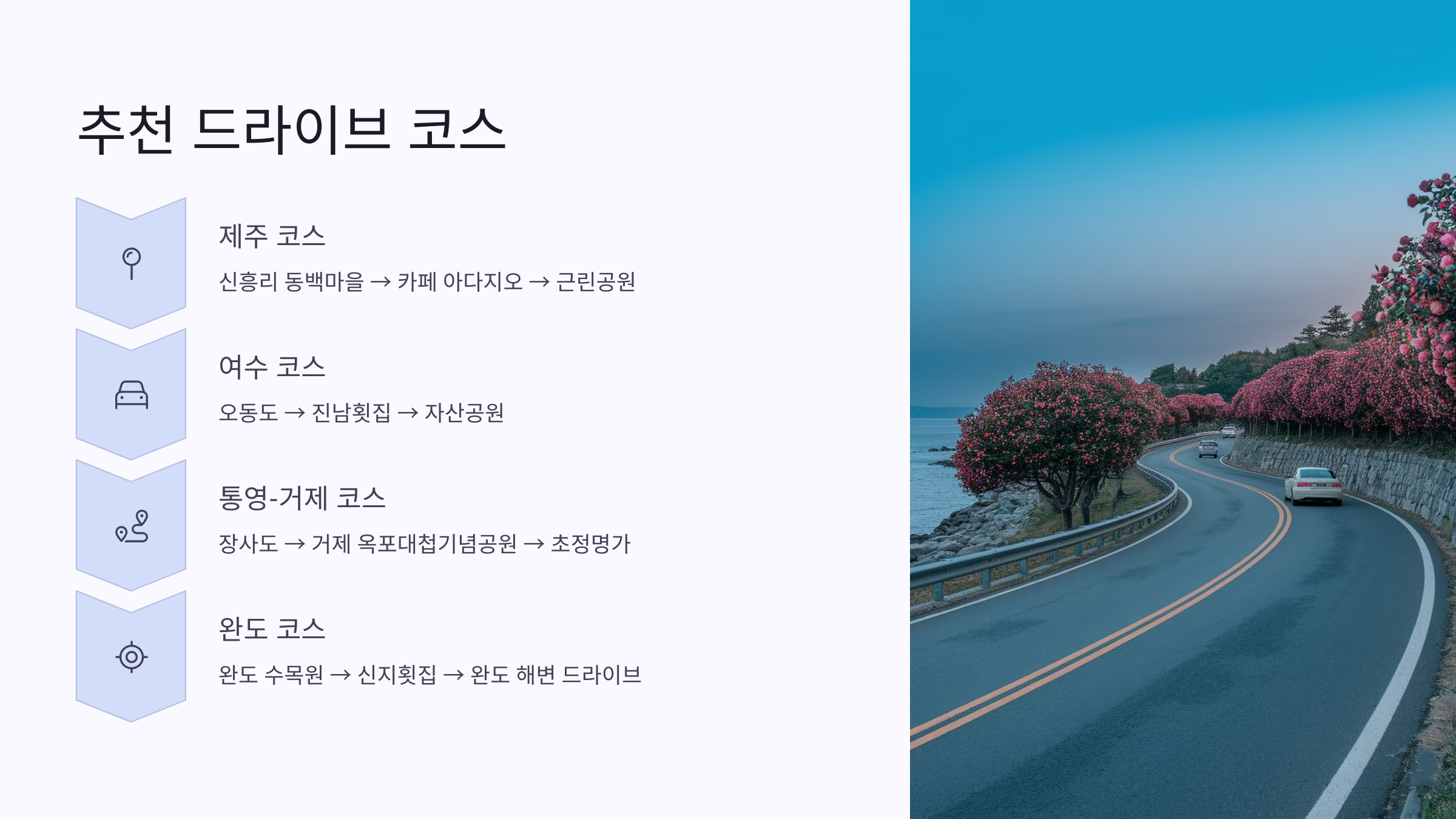 동백꽃 드라이브는 풍경, 거리, 중간에 들를 명소까지 잘 짜여져야 만족도 100%예요. 이번에는 코스별 추천 루트를 알려줄게요. 지역마다 즐기는 방법이 다르기 때문에 운전 스타일이나 시간대에 따라 골라보면 좋아요!