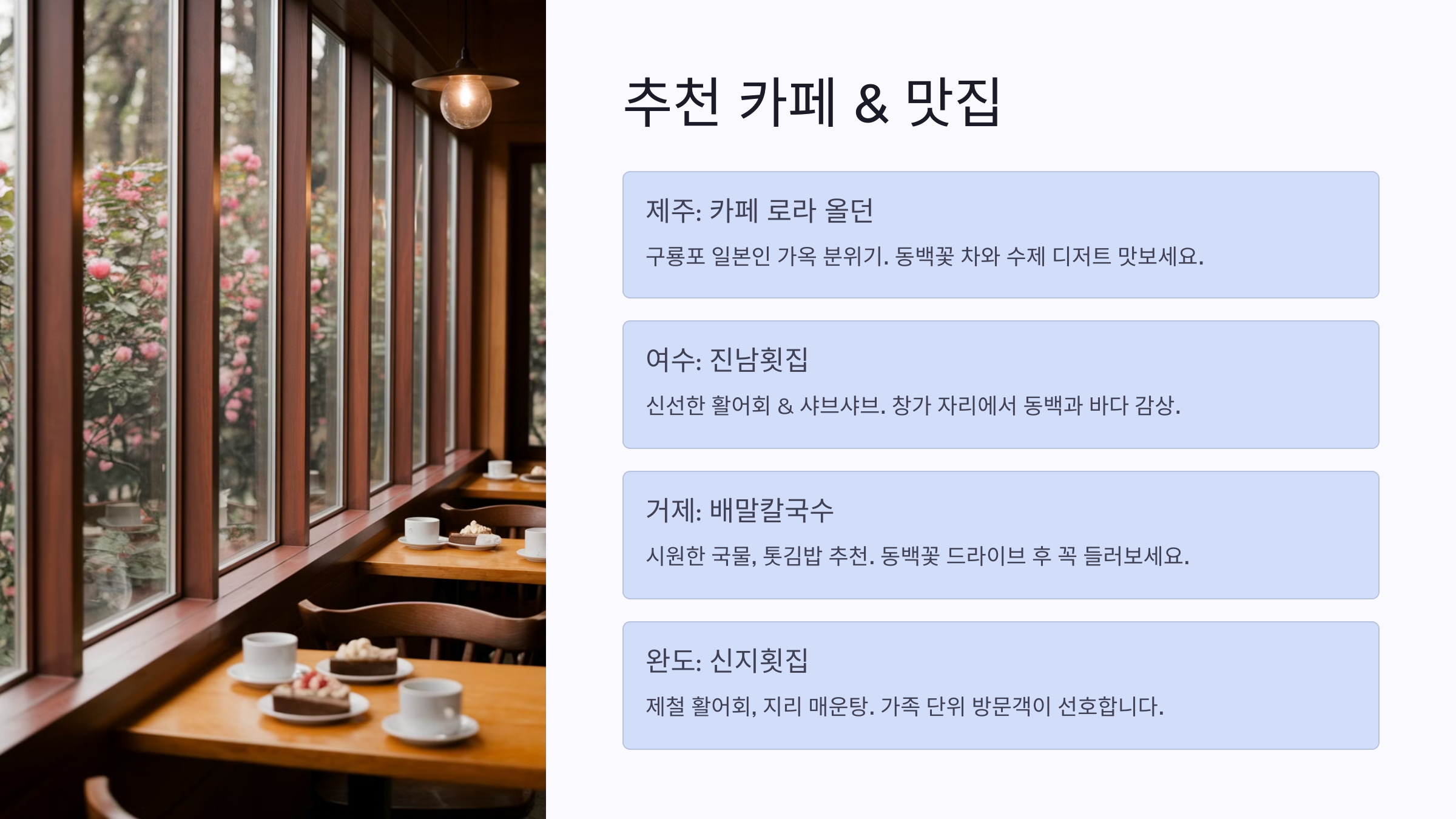 동백꽃 보러 갔다면 풍경만 보고 오면 섭섭하죠! 중간에 들를 만한 감성 카페나 현지 맛집까지 코스에 넣어줘야 진짜 힐링 드라이브 완성! 지역별로 인증샷 명소 + 인기 메뉴 중심으로 소개할게요.