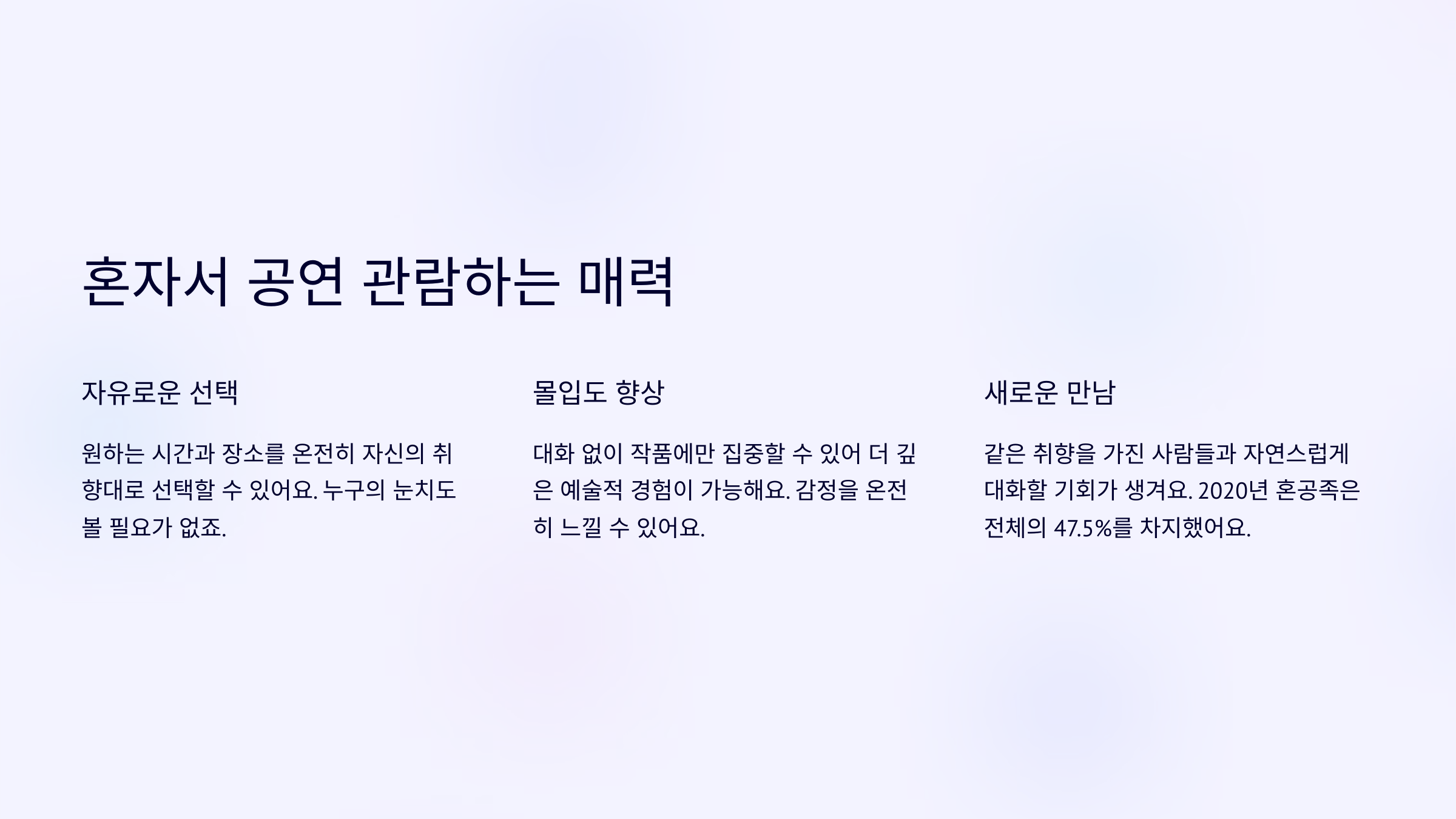 뮤지컬이나 연극 같은 장르의 공연은 극중 감정선에 몰입할수록 관람의 재미가 배가되는데요, 혼자 가면 감상 중에 머릿속으로만 정리할 수 있어서 생각이 더 깊어지고, 기억에도 오래 남아요. 예술 작품을 내 방식대로 해석하고 받아들이는 데 집중할 수 있어요.
