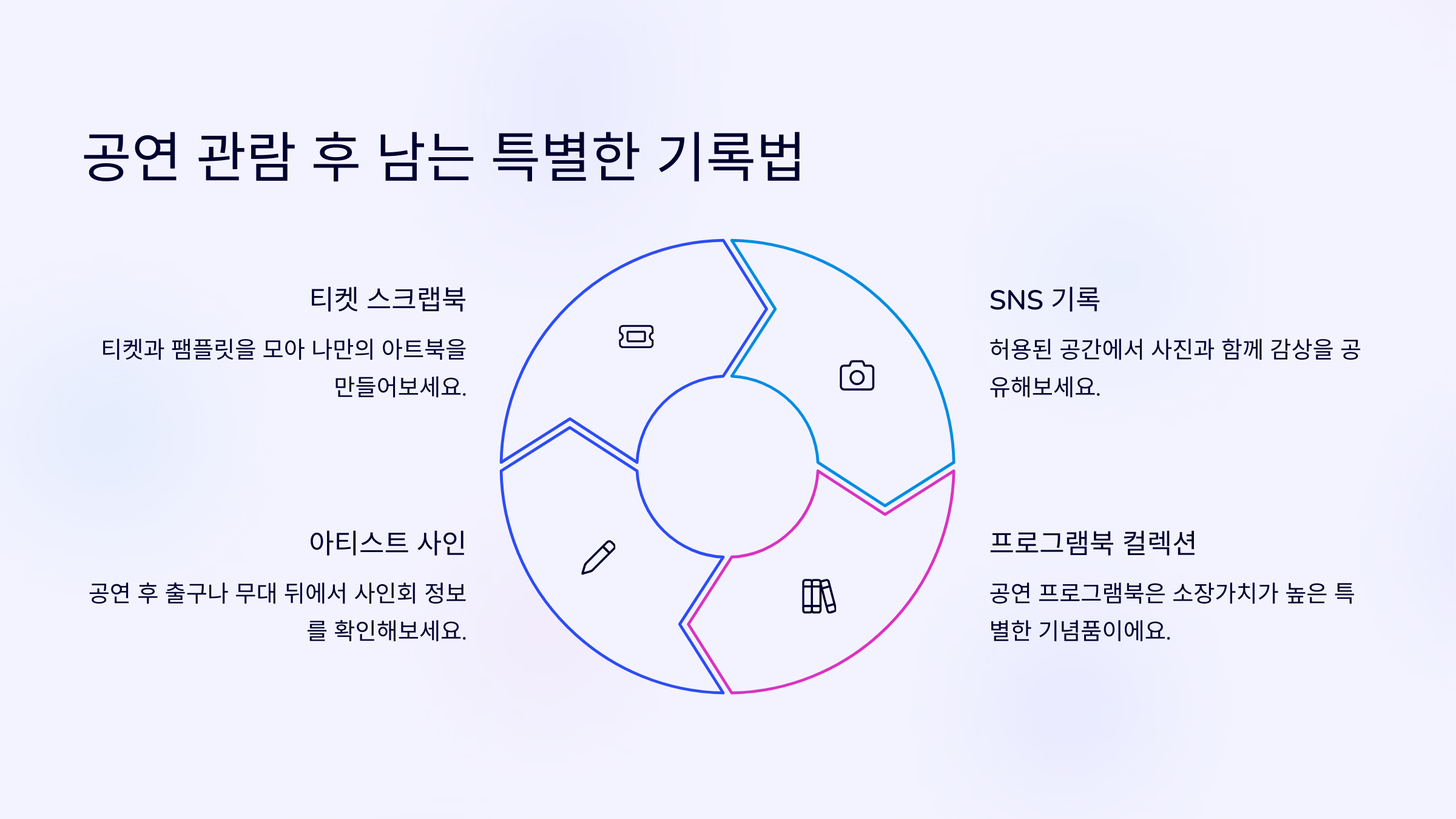 그다음은 나만의 루틴을 만드는 거예요. 예를 들어, 전시 관람 후 도록을 꼭 구입한다든지, 공연이 끝난 뒤 기록 노트에 감상을 적는다든지요. 이런 작은 습관이 하나둘 쌓이면, 전시/공연 여행이 단순한 외출이 아니라 ‘나를 채우는 시간’이 되기도 해요.