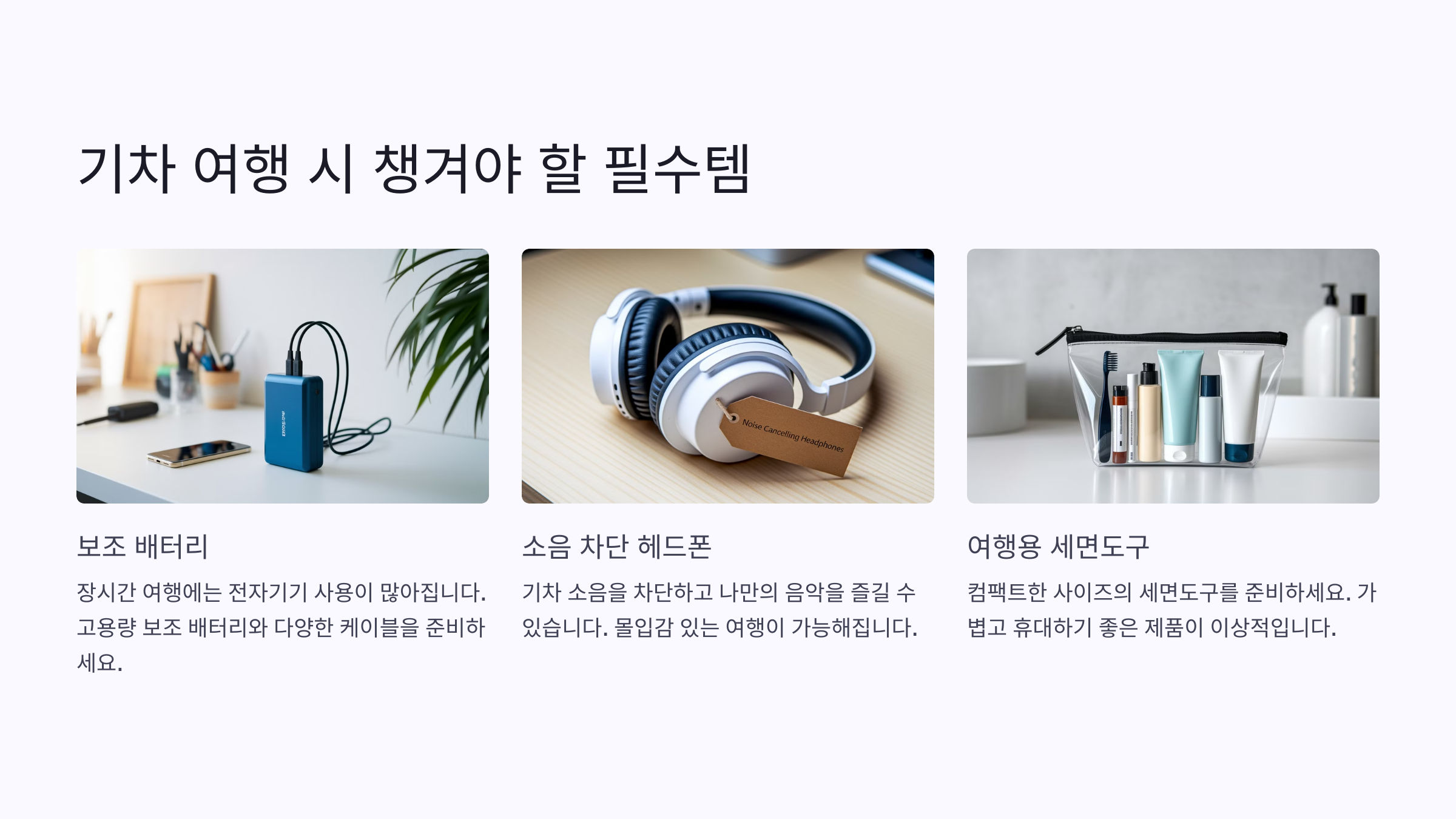 가장 먼저 필요한 건 넉넉한 보조배터리! 기차 안에서는 충전이 어려운 경우가 많아서 스마트폰, 태블릿 등을 오래 사용하려면 필수예요. 또, 편안한 여행을 위해 목베개나 얇은 무릎담요도 챙기면 좋아요.