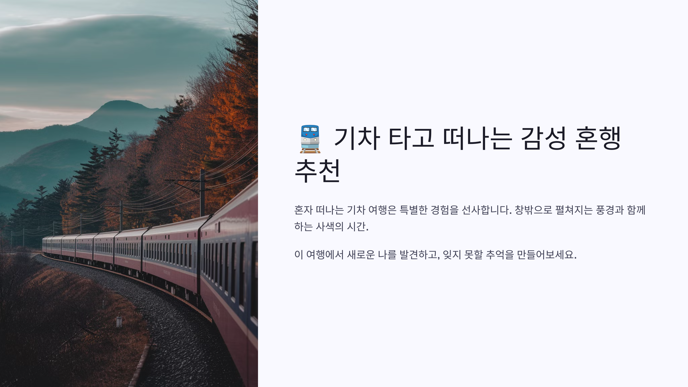 기차 여행은 시간이 느리게 흐르는 듯한 특별한 분위기를 선사해줘요. 혼자만의 여유로운 순간을 원할 때, 북적이지 않고 여유롭게 떠나는 교통수단이 바로 기차예요. 어디를 가든 도착까지의 여정도 여행의 일부가 되는 경험, 그게 바로 기차 여행의 진짜 매력이에요.