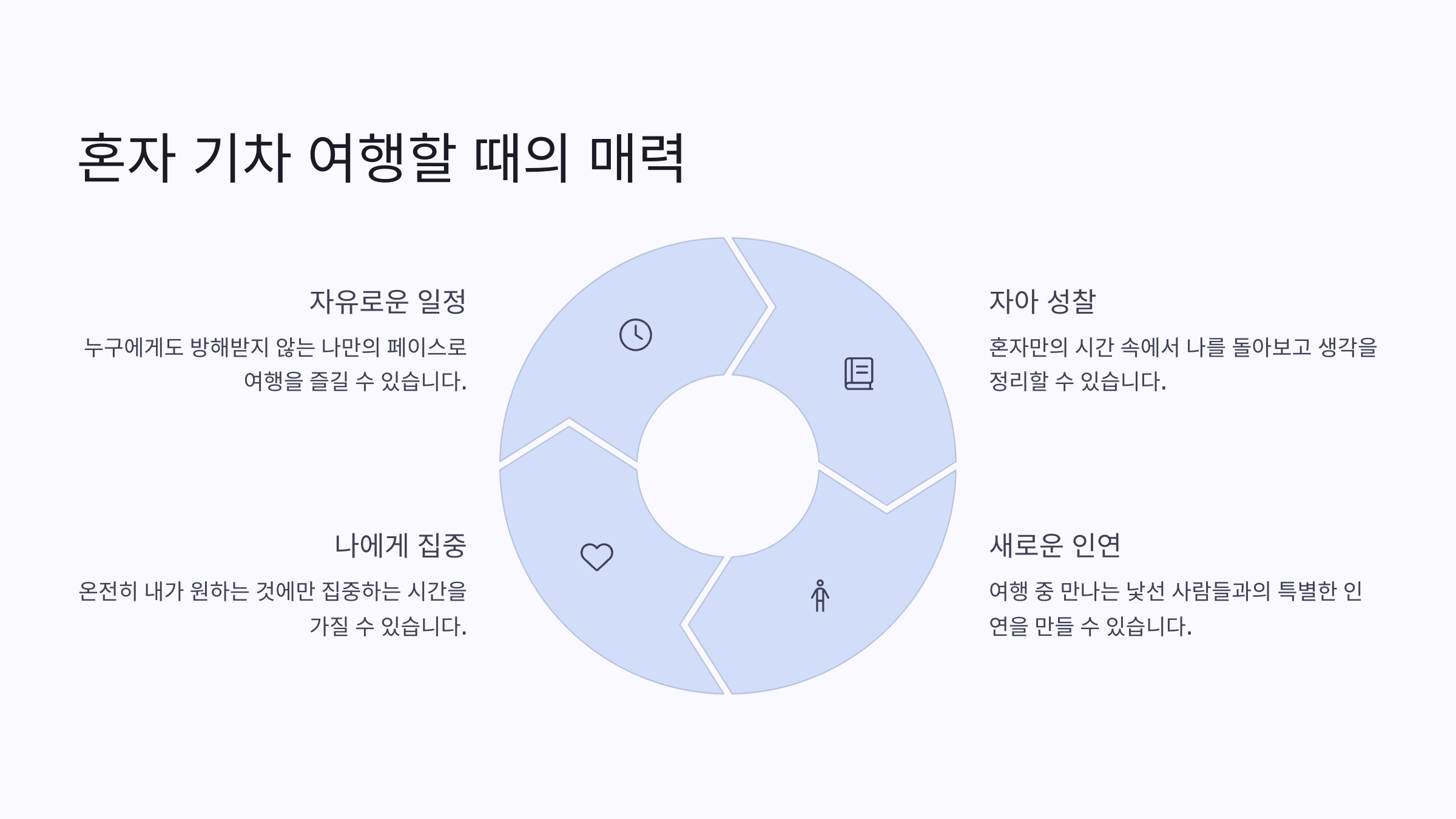 누구와도 이야기하지 않아도 괜찮고, 아무것도 하지 않아도 지루하지 않은 게 혼행의 진짜 매력이에요. 타인의 시선에서 벗어나 나 자신을 오롯이 마주할 수 있는 순간이 바로 혼자만의 기차 여행 속에 있답니다.