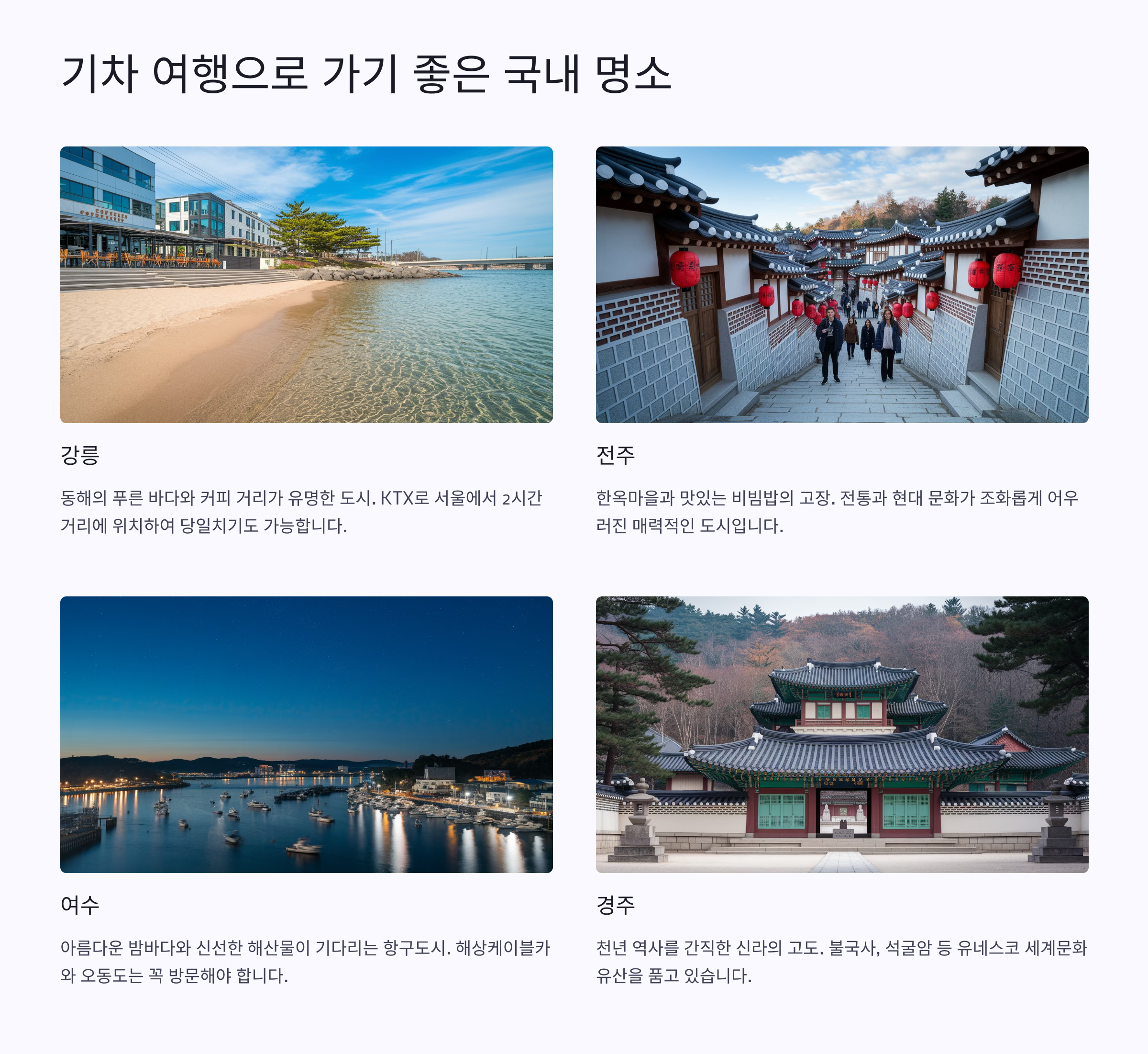 | 부산 | KTX, SRT | 해운대, 감천 | 바다와 예술, 산책 |