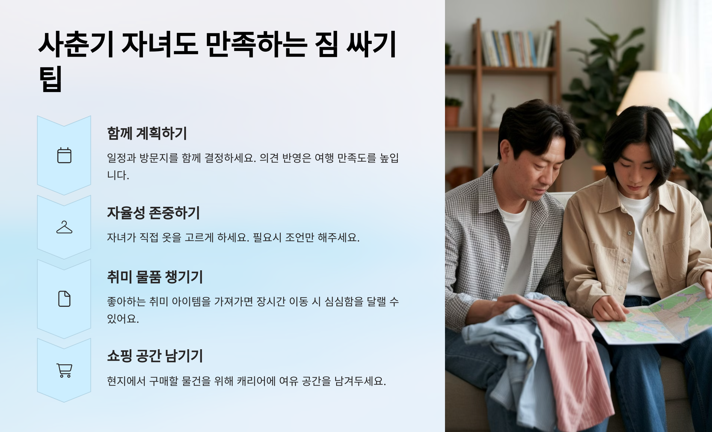 사춘기 자녀와 여행할 때는 부모 입장에서 단순히 '필요한 물건'만 챙기는 게 아니라, 자녀의 기분과 라이프스타일까지 고려해줘야 해요. 예를 들어, 옷은 부모가 고른 것보다 자녀가 스스로 고른 아이템을 챙기게 해야 불만이 줄어요. 옷이 마음에 들지 않으면 여행 내내 기분도 안 좋을 수 있거든요.