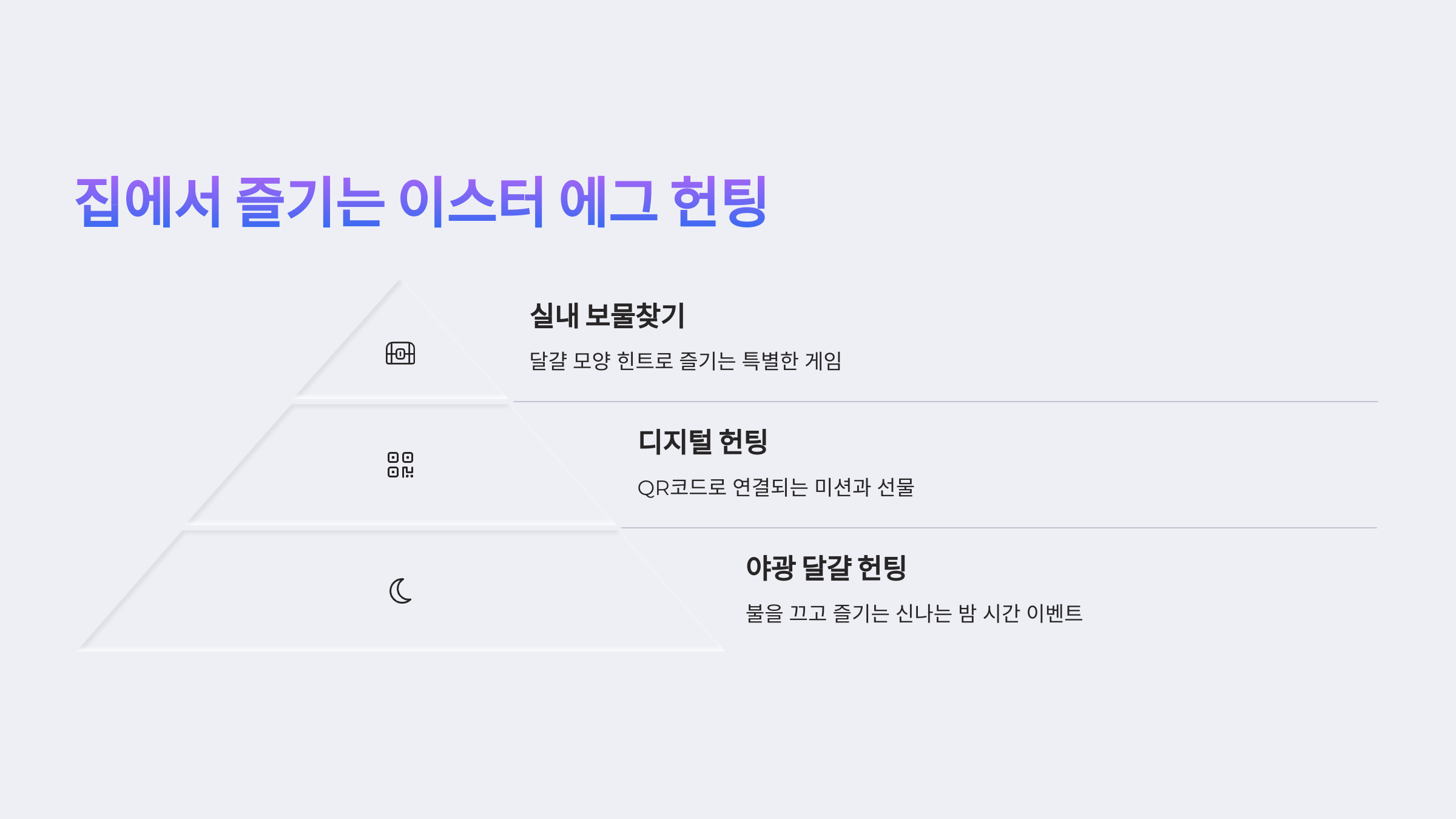 | 플라스틱 이스터 에그 | 간식, 메시지 넣기 | 전 연령 | 찾는 재미 |