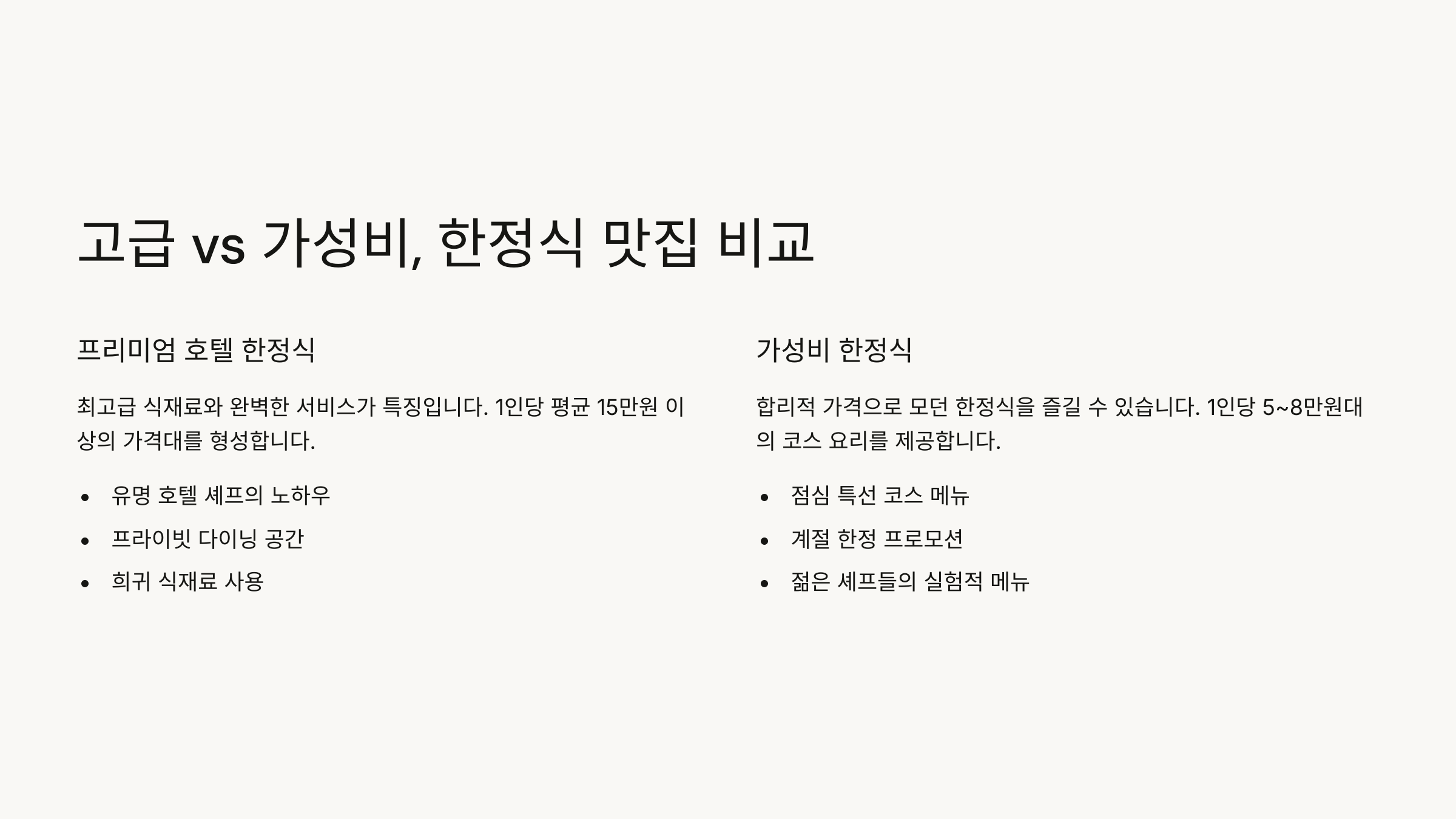 | 구분 | 호텔 레스토랑 | 가성비 맛집 |